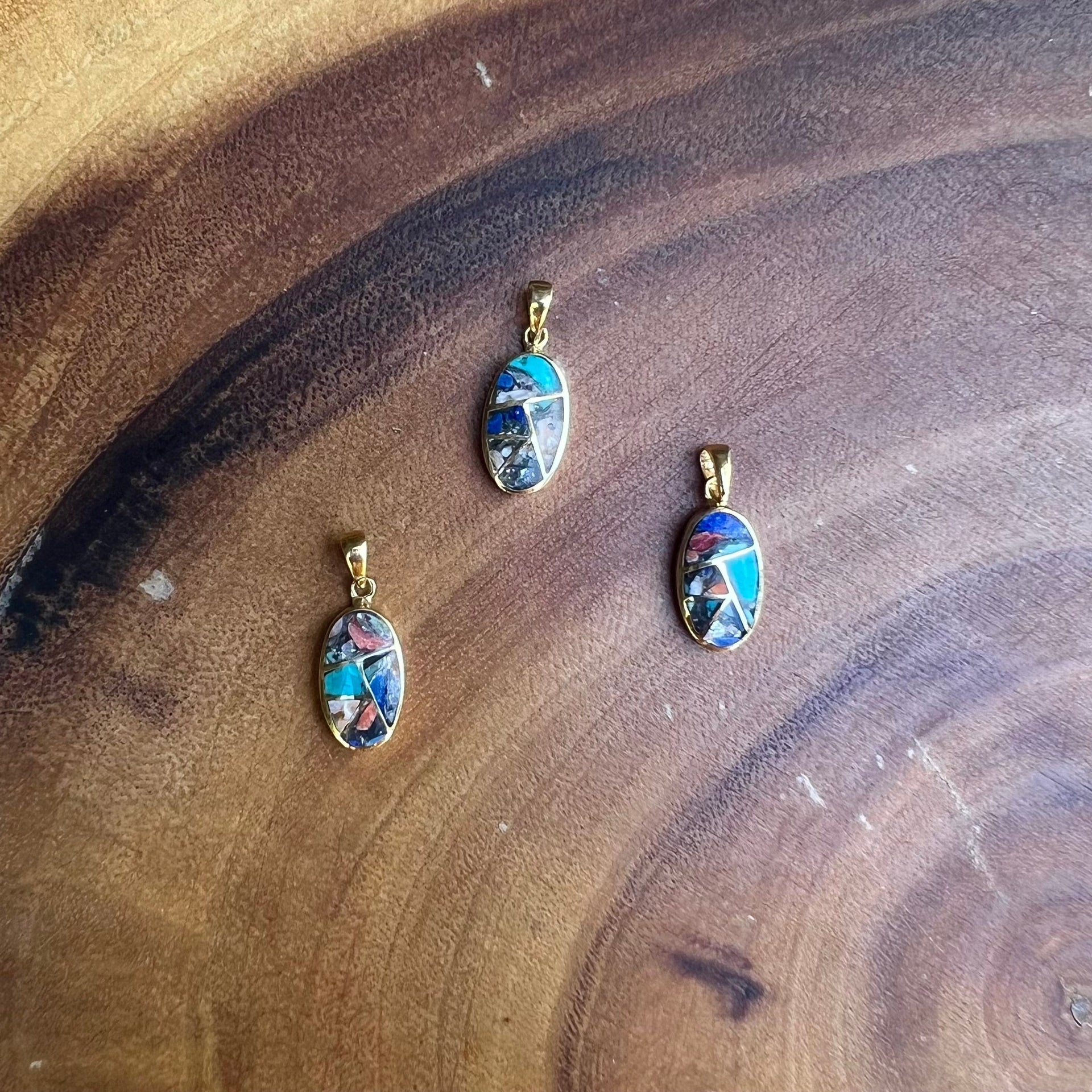 Our chic Grid Inlay Oval Pendant measures 1” from the top of the bale to the bottom of the pendant. At the widest point the oval measures approximately 3/8” across. You will receive the exact pendant you select.