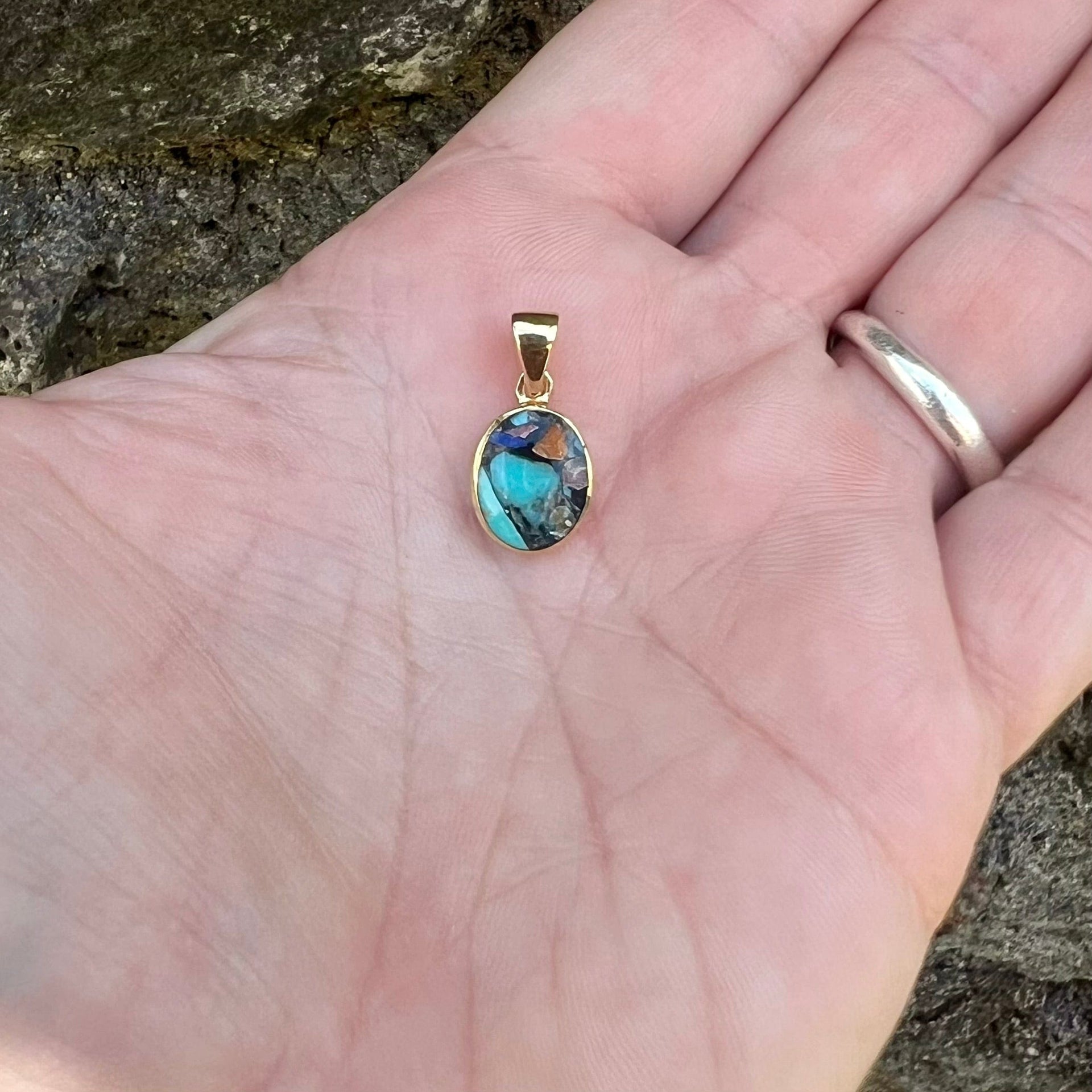 Our delicate Small Oval Pendant measures 3/4” from the top of the bale to the bottom of the pendant. At the widest point the oval measures approximately 3/8” across. You will receive the exact pendant you select.