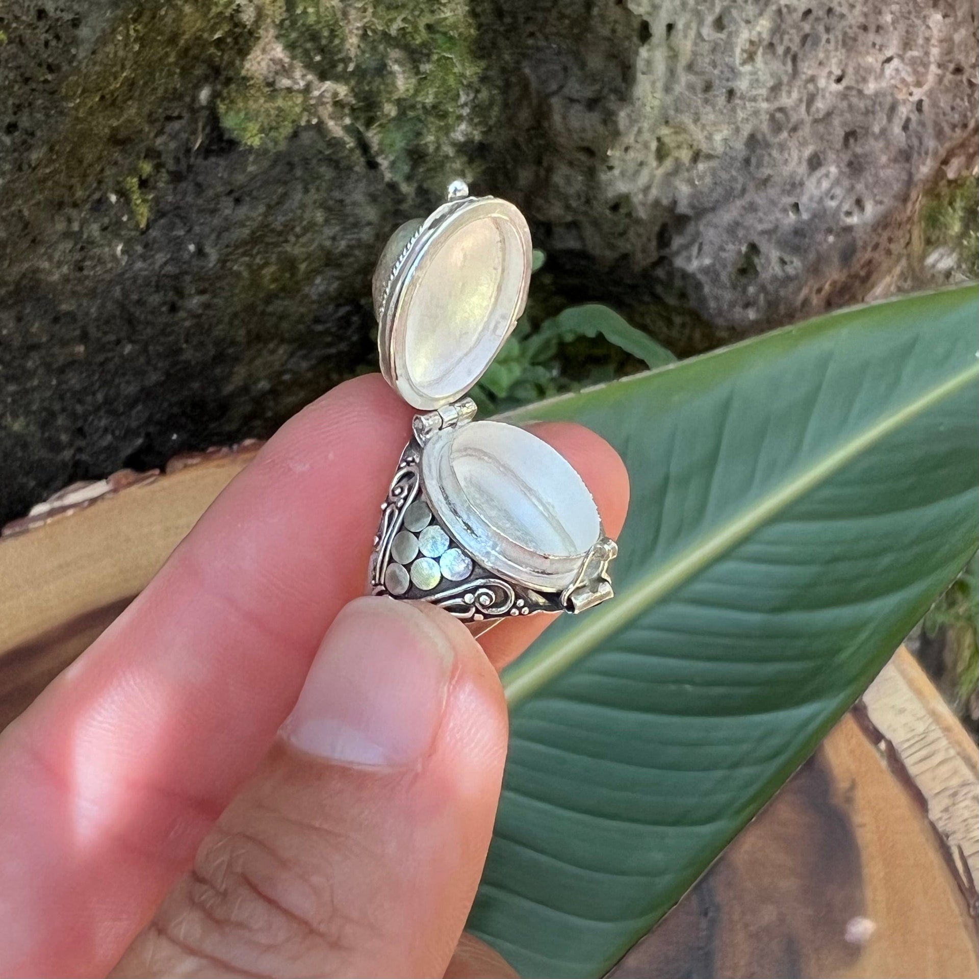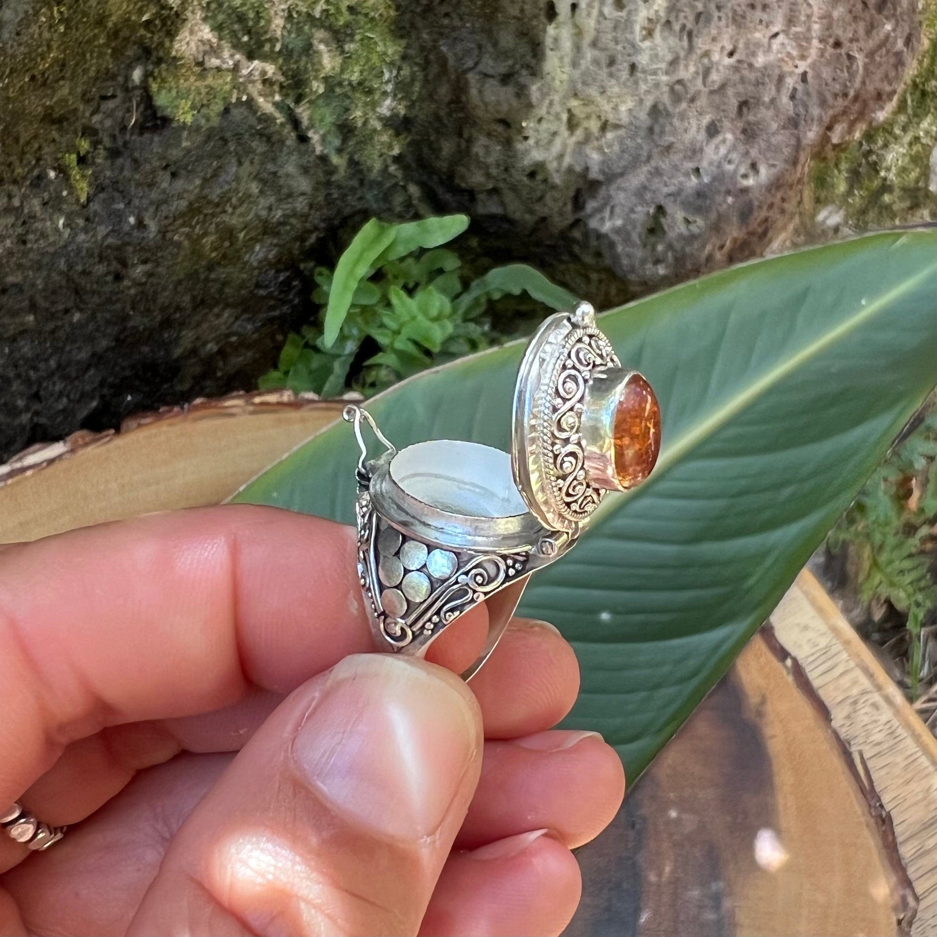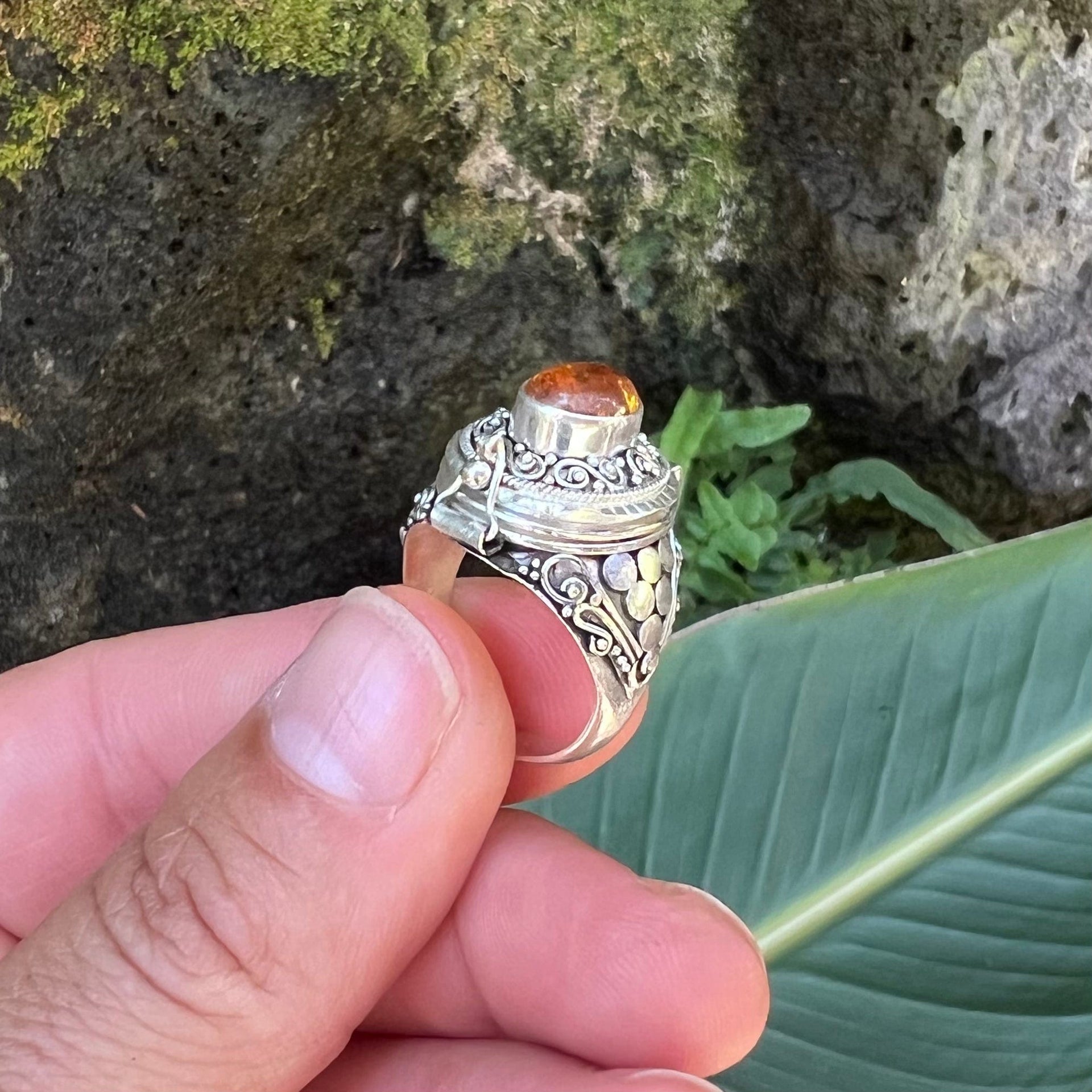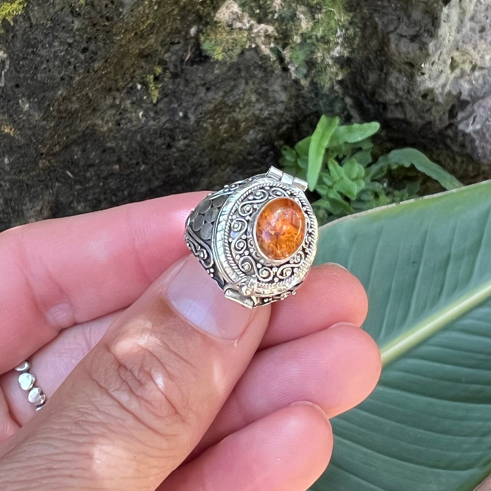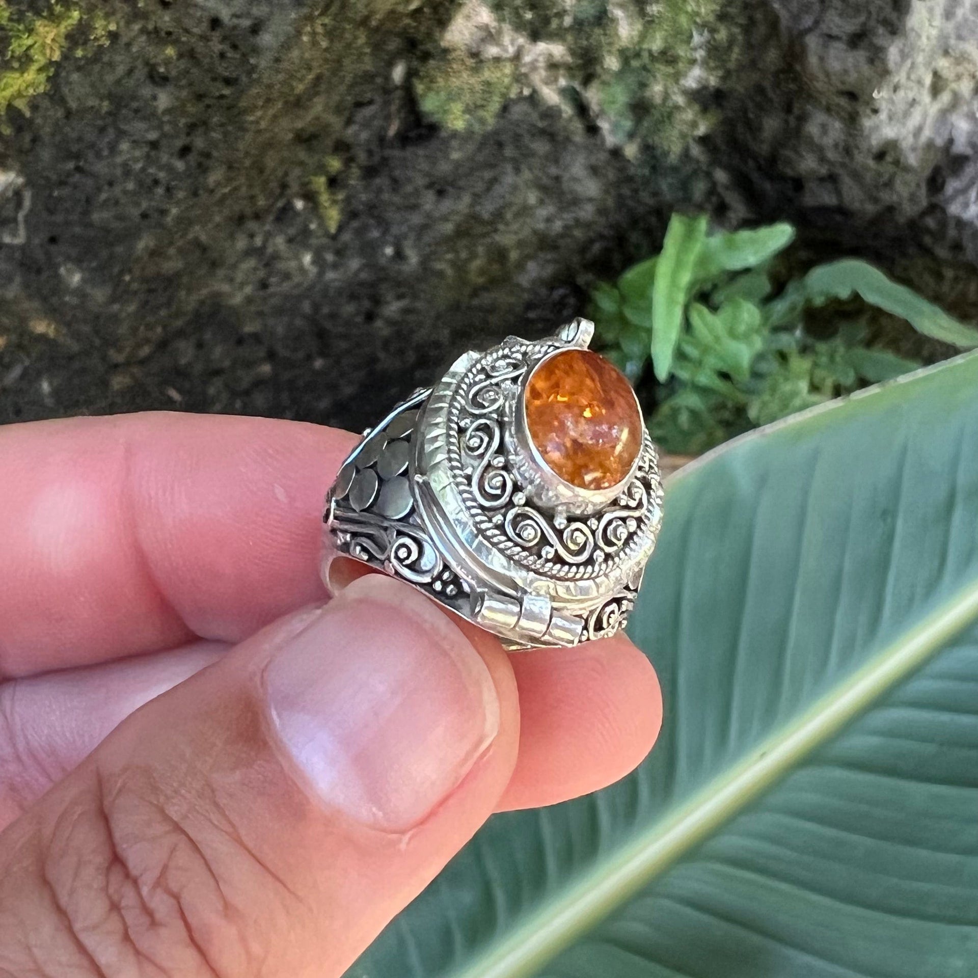Baltic amber is made from tree resin that has been fossilized over millions of years, making it an incredibly beautiful gemstone for creating one-of-a-kind jewelry. This stunning Baltic amber ring is made with .925 sterling silver. The filagree accents highlight the beautiful cognac color of the amber. Referred to as a poison ring this design features a cute little hidden compartment that you can use to keep a small treasure close at hand. Please do not use this to actually conceal poison to use against people.