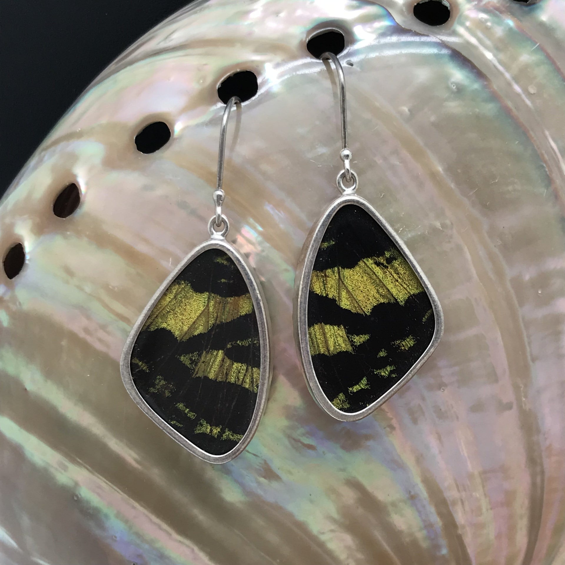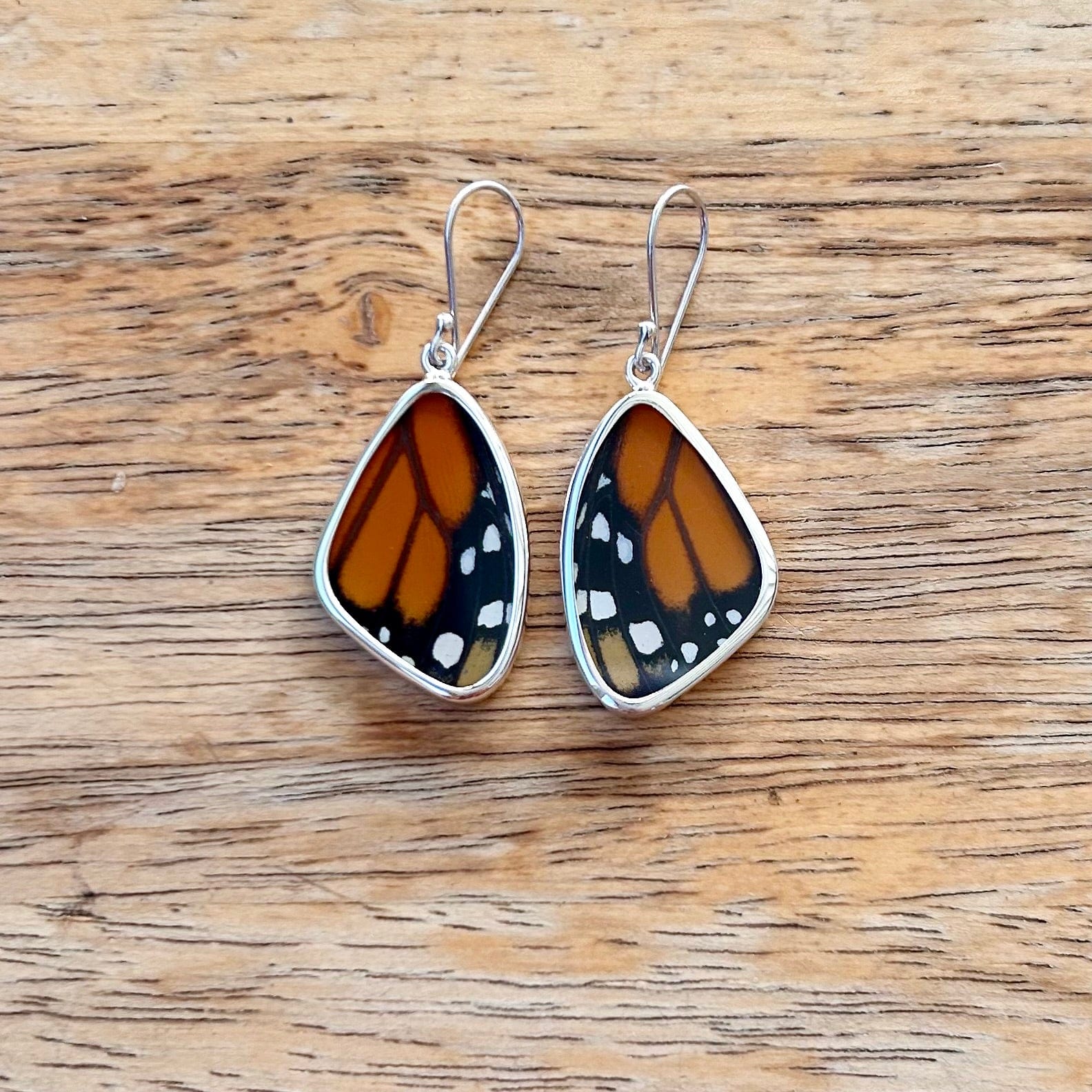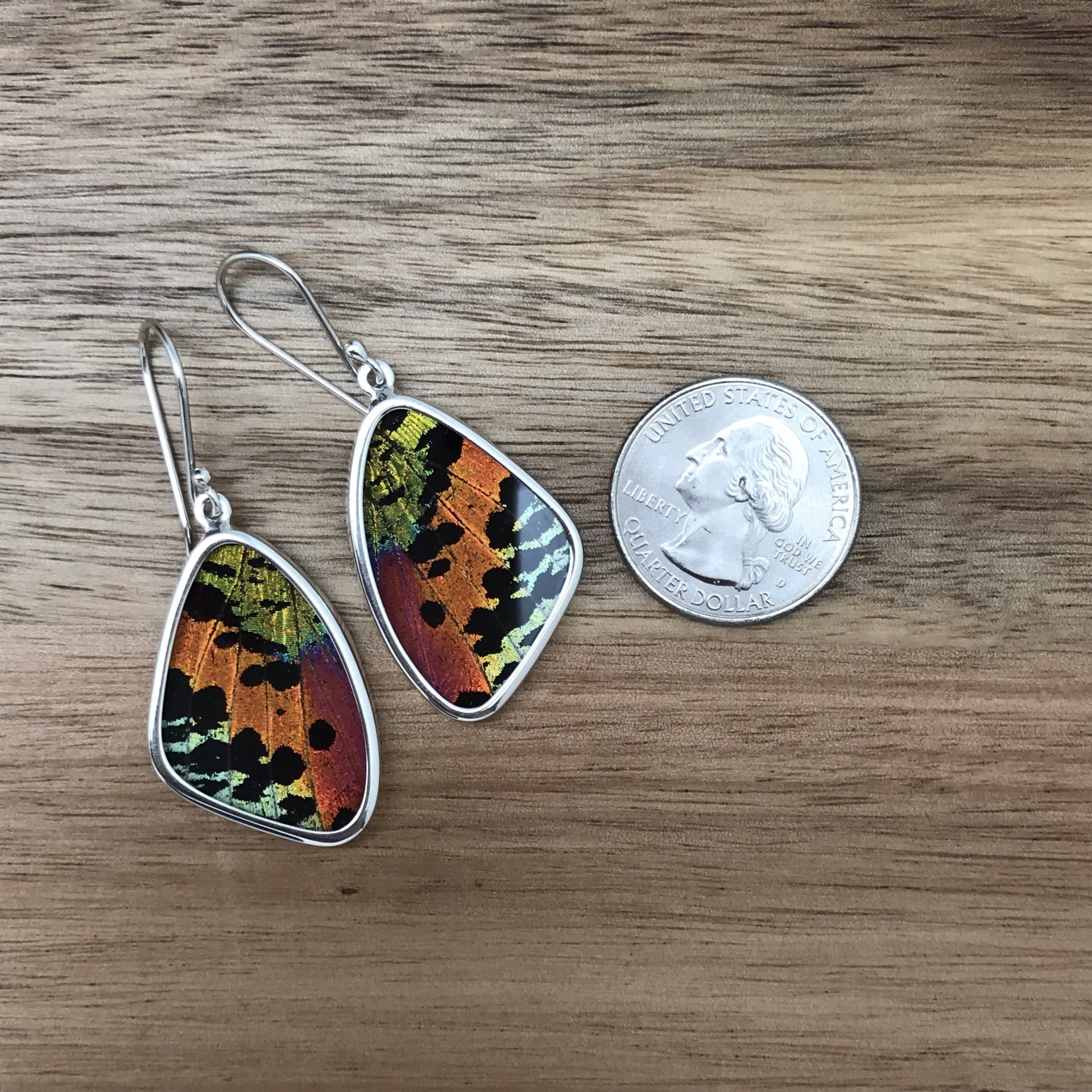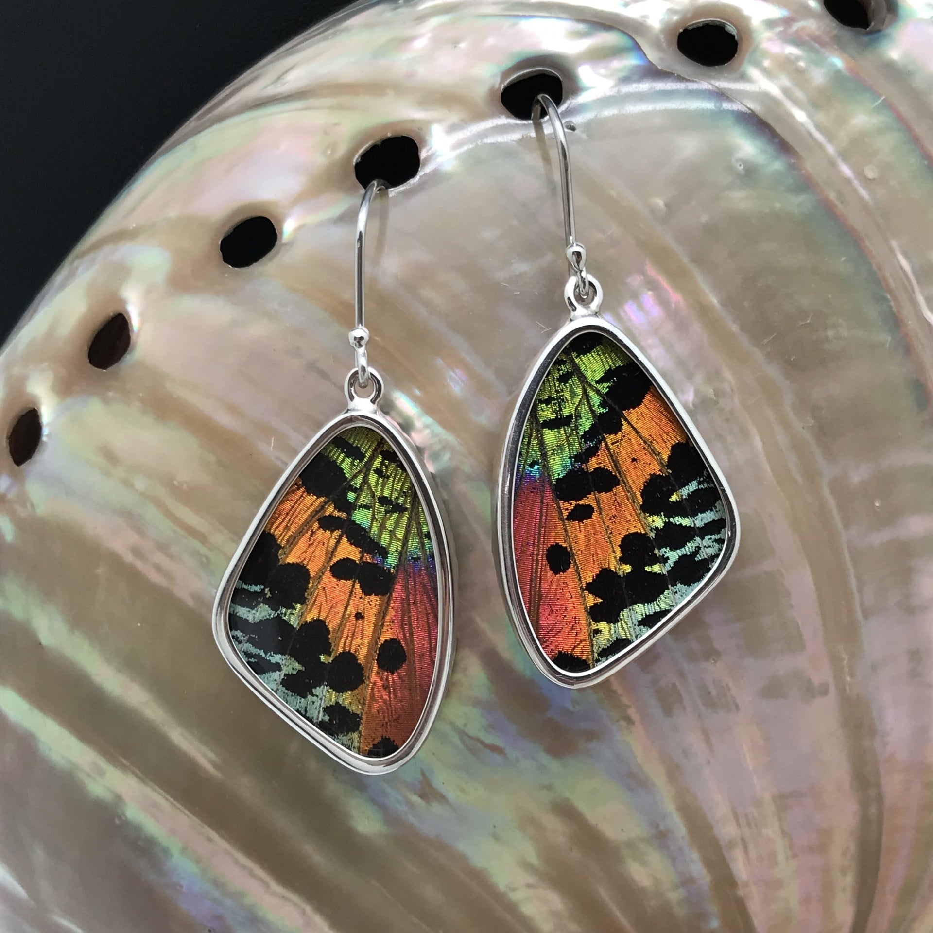 These beautiful wing style earrings are made with real butterfly wings set in high quality acrylic and sterling silver. Because they are made with natural wings, each piece is unique, and may have some color variations that differ slightly from the pictures. This style comes in eleven different wing styles.
