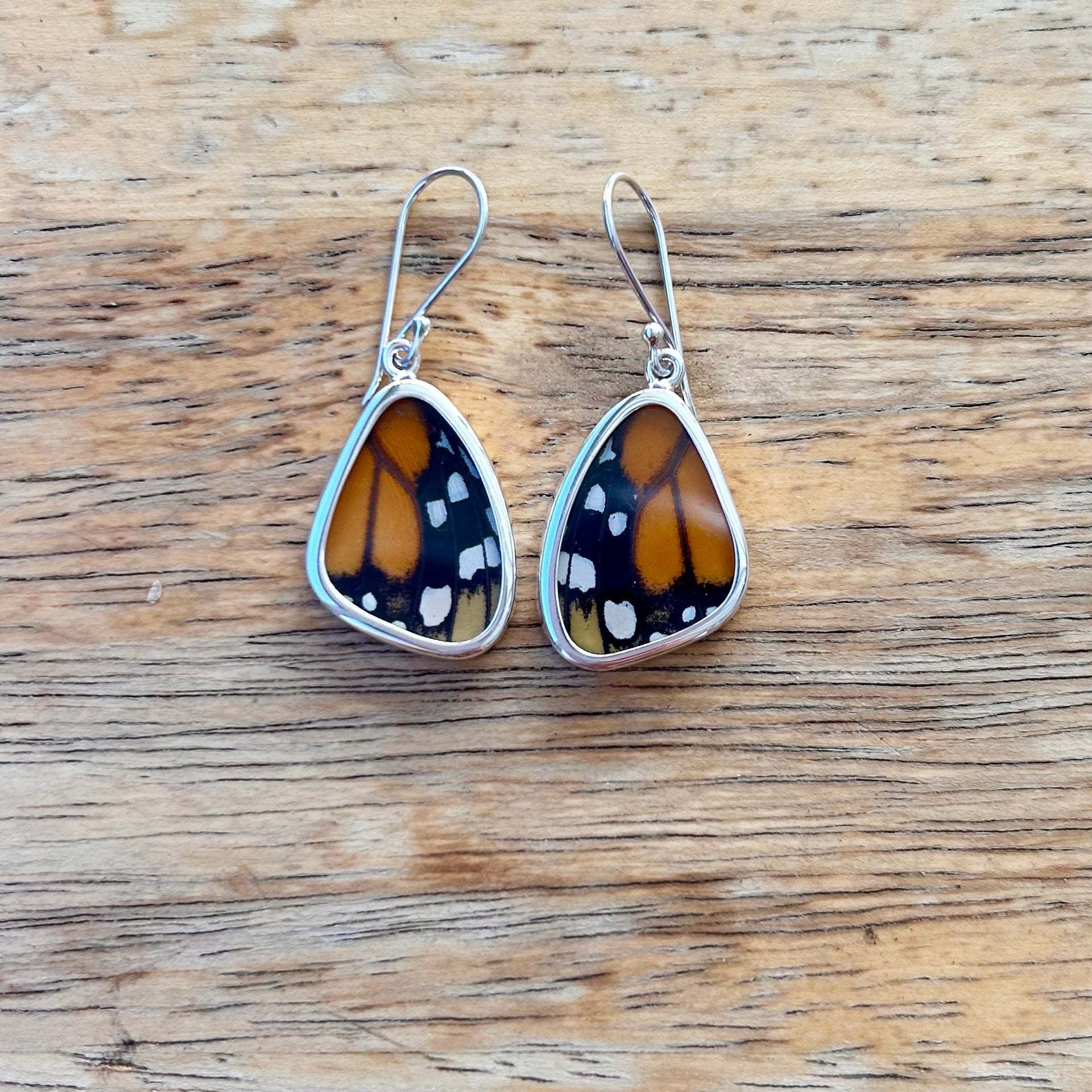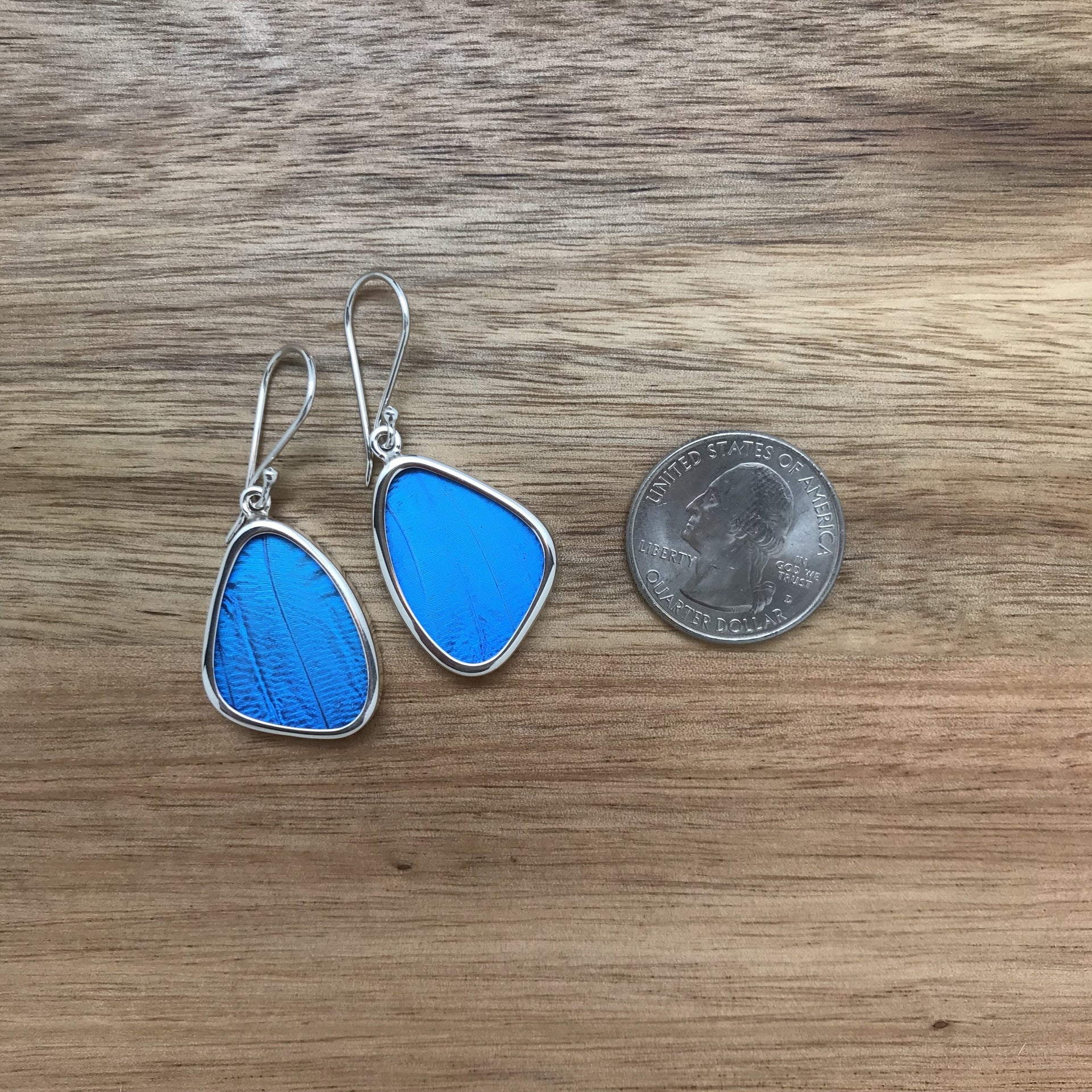 These beautiful wing style earrings are made with real butterfly wings set in high quality acrylic and sterling silver. Because they are made with natural wings, each piece is unique, and may have some color variations that differ slightly from the pictures. This style comes in eleven different wing colors.