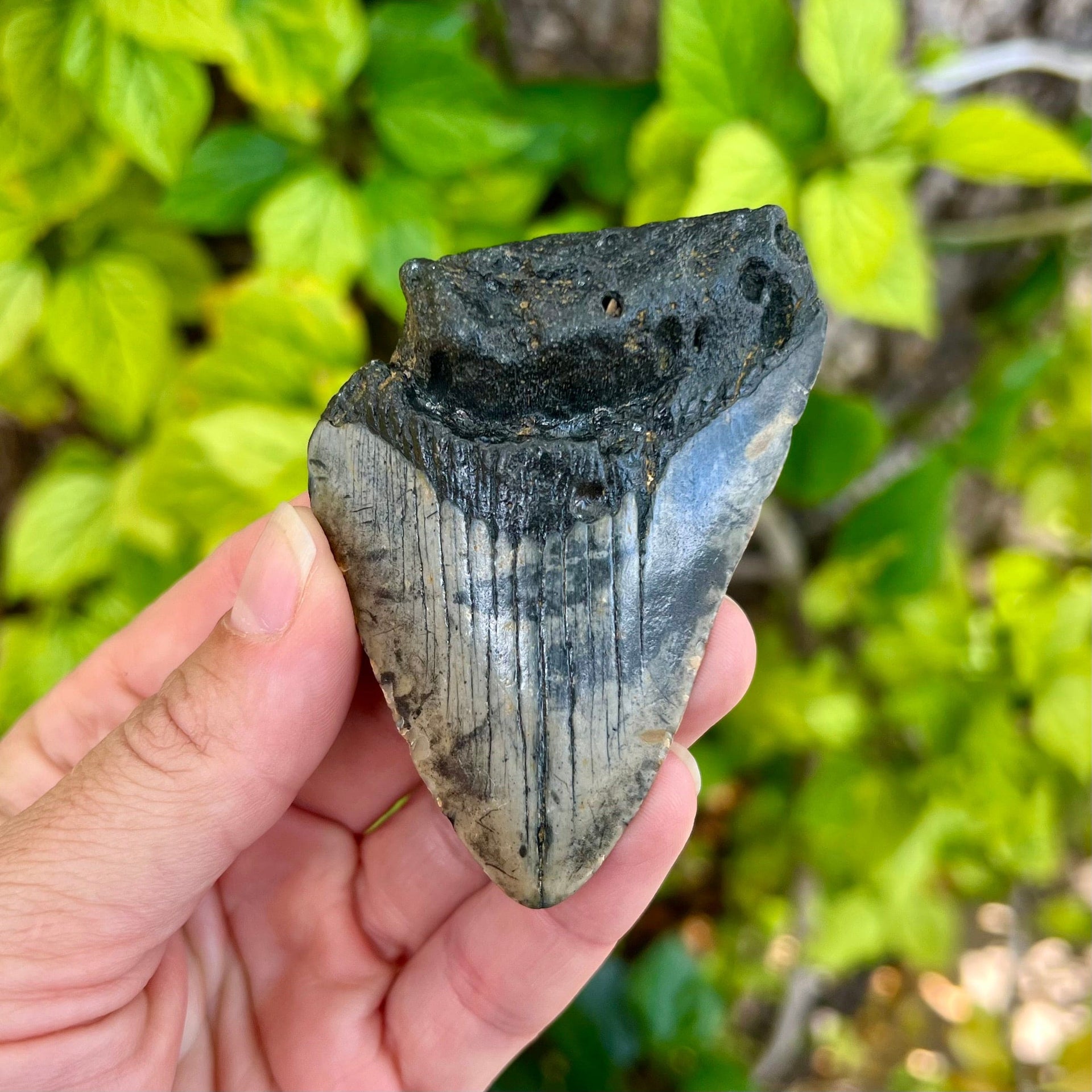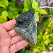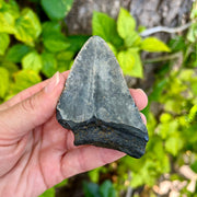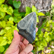 This megalodon tooth measures 3 1/4" from the corner of the root to the tip of the tooth on the intact side. It has a mottled crown with a darker grey root. It is a great tooth for a budding collector.