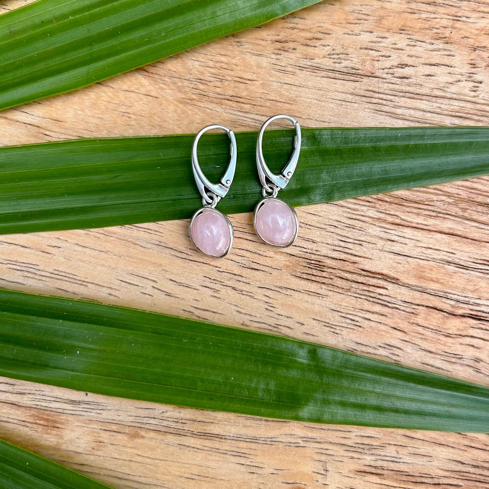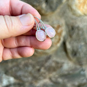 Whaler's Locker's Rose Quartz Drop Earring's are soft, dusty pink. The oval cabochon is set in a simple, but elegant frame of .925 sterling silver. The cabochons dangle from a French hook. The earrings measure approximately 1 1/8" in total length with a width of about 3/8".
