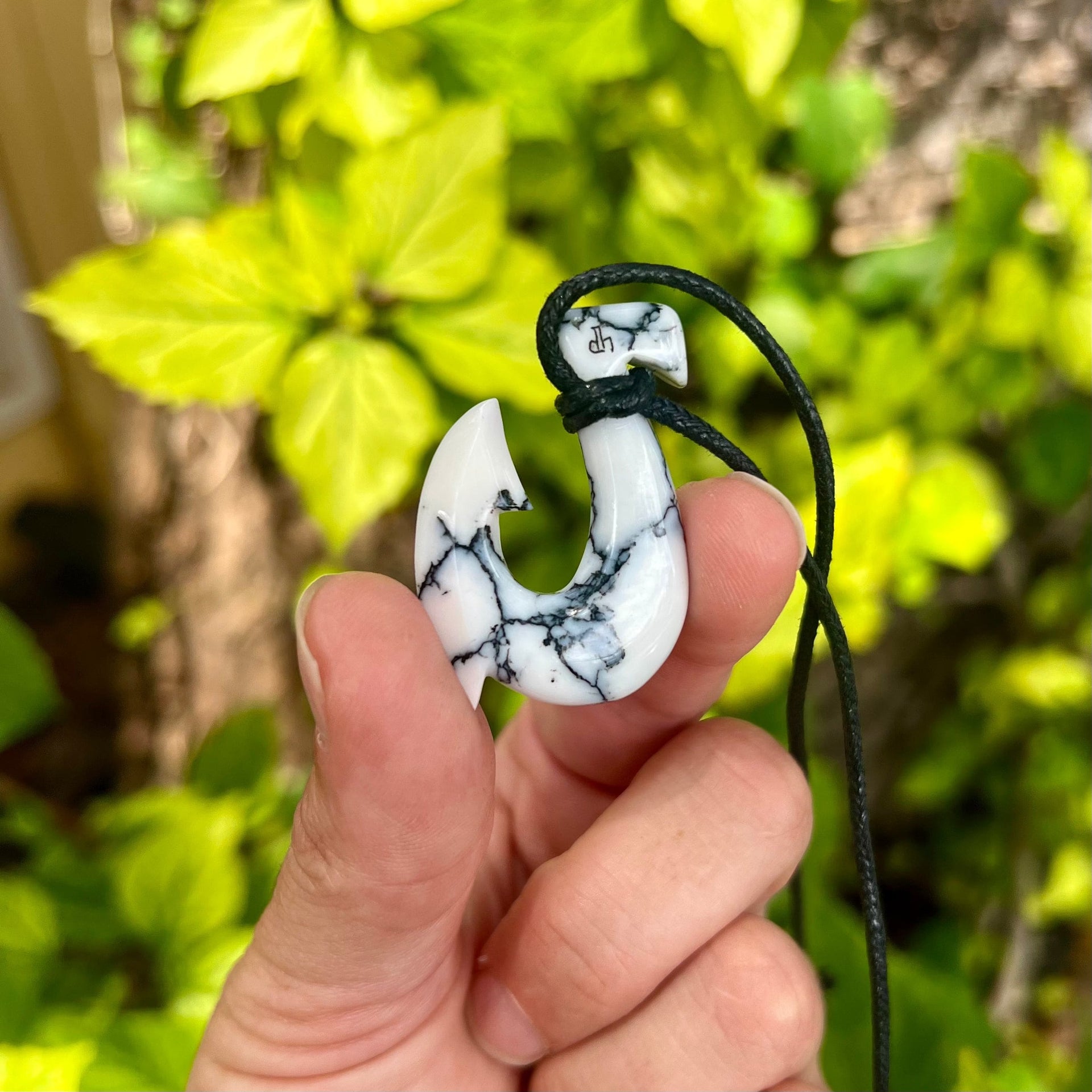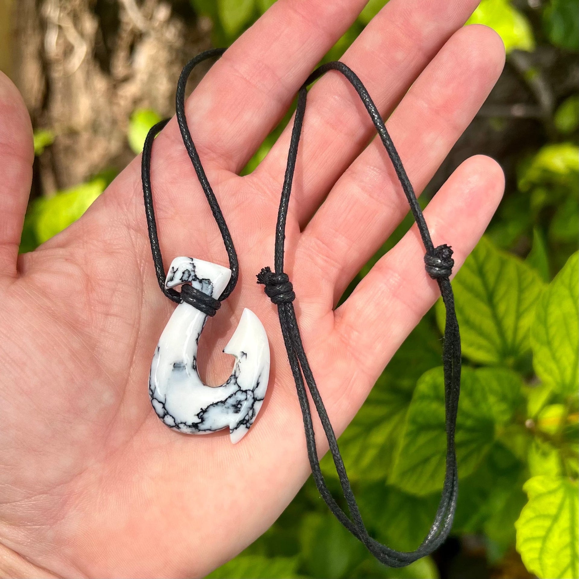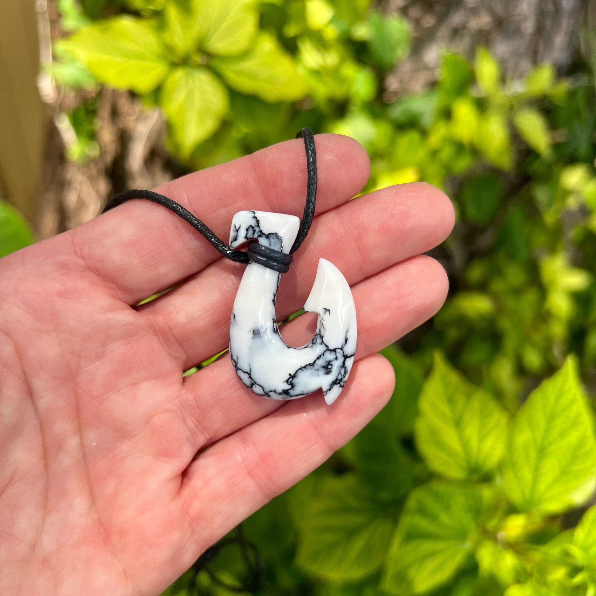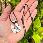 Hand carved white turquoise composite fishhook necklace by local Maui artist David Haake. This hook measures approximately 1.5” tall and features black matrix accents. Comes on a fully adjustable cotton cord.