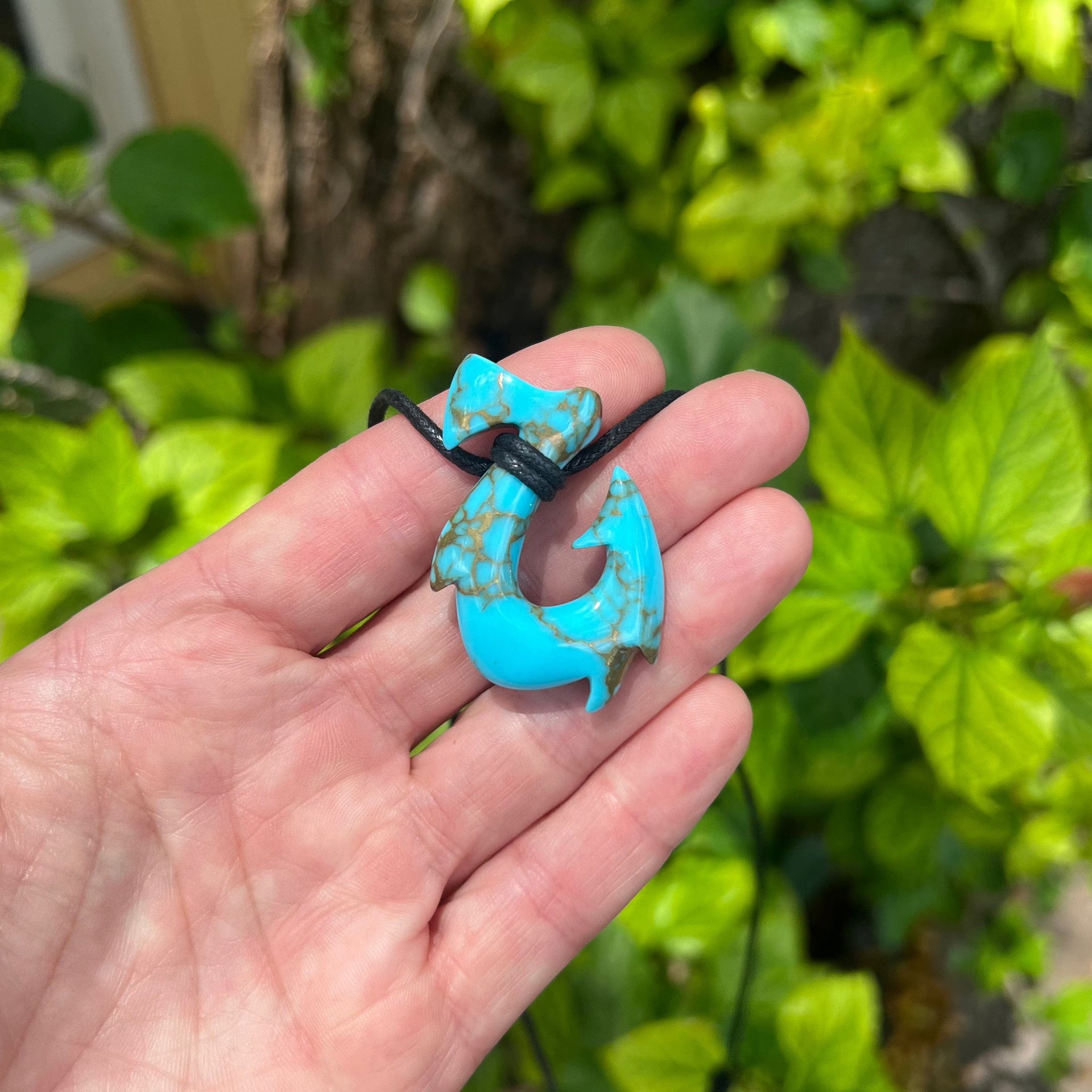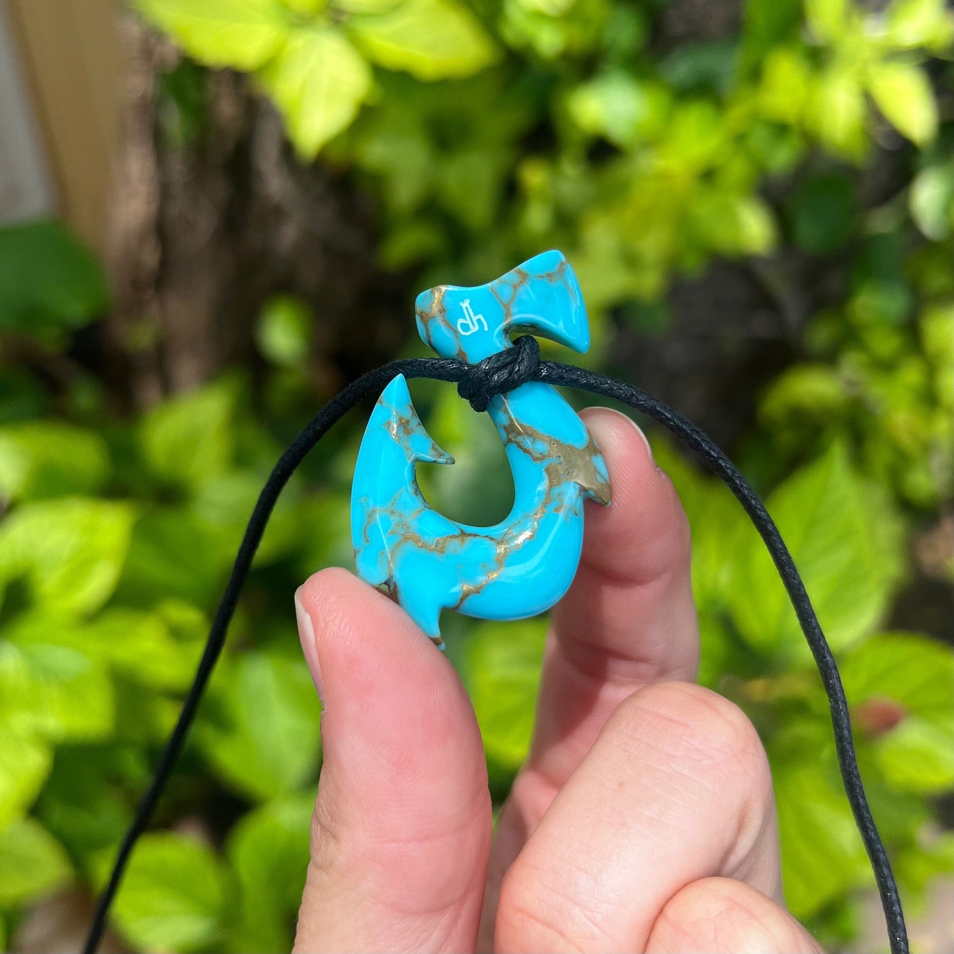 Hand carved turquoise composite fishhook necklace by local Maui artist David Haake. This hook measures approximately 1.5” tall and features pyrite matrix accents. Comes on a fully adjustable cotton cord.