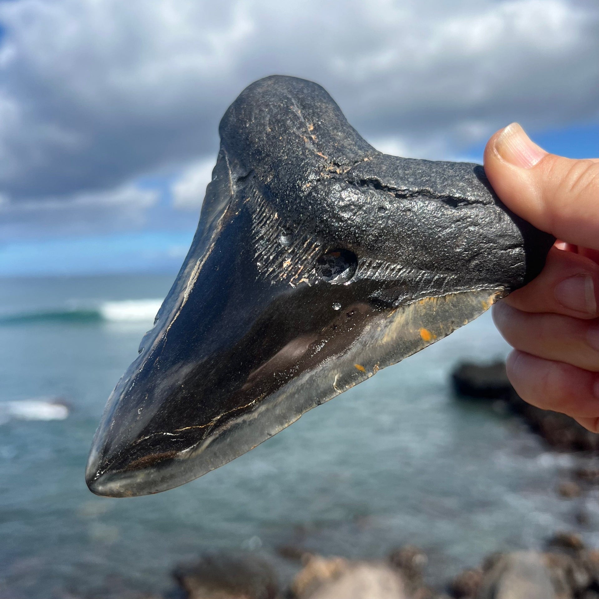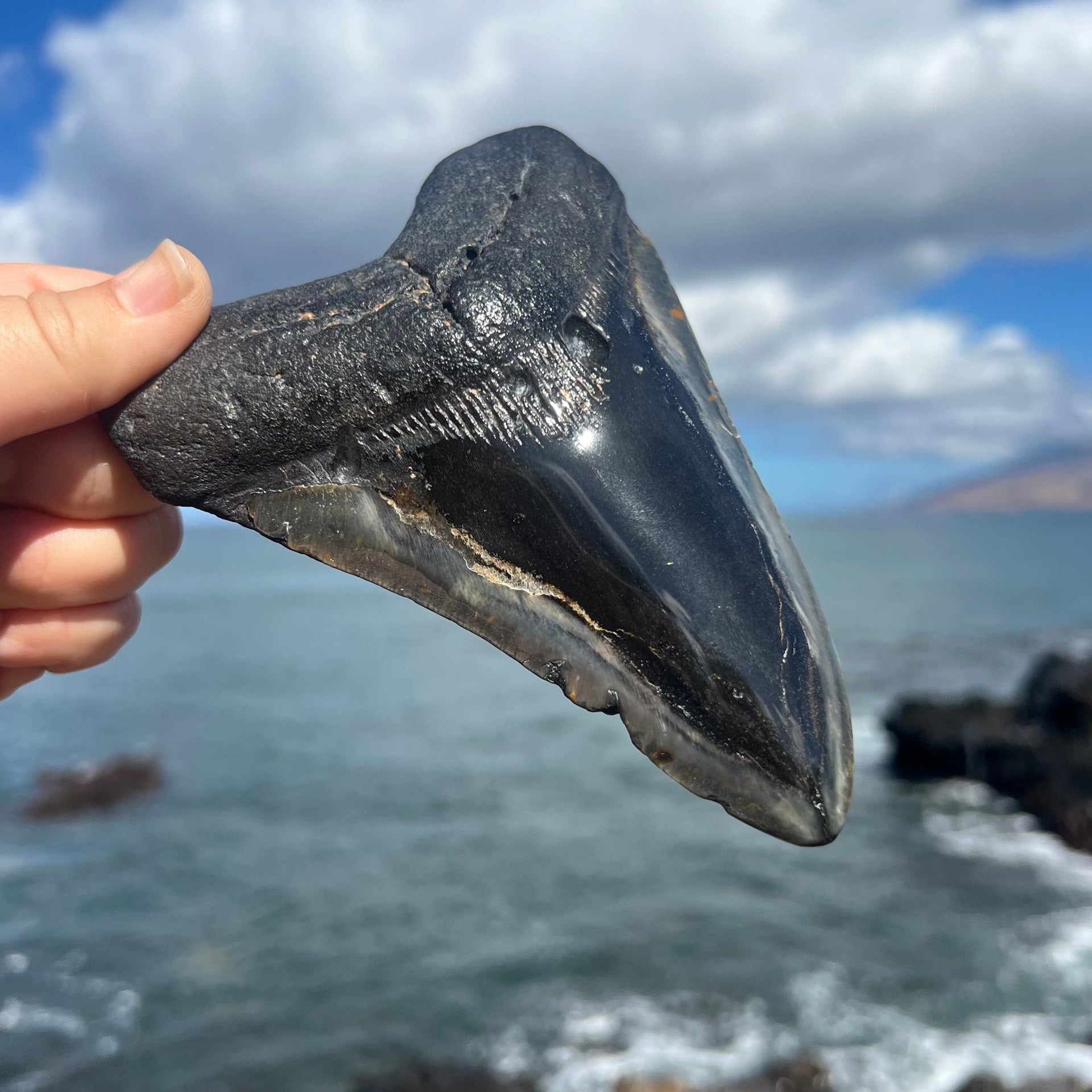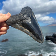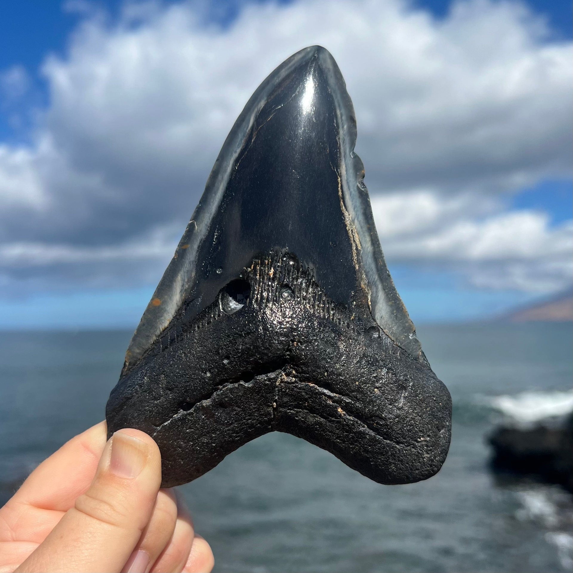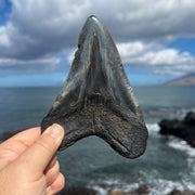 This beautiful polished Grade A megalodon tooth measures approximately 5 7/8" inches from the corner of the root to the tip of the tooth along the longest edge. This dark tooth features gorgeous coloration with a matte black root and crown of slate grey with a deep black interior. The tooth displays a clear bourlette and is polished on both sides. The polishing on the tooth brings out a ferocity to this specimen. Add this tooth to your cart now before you miss out!