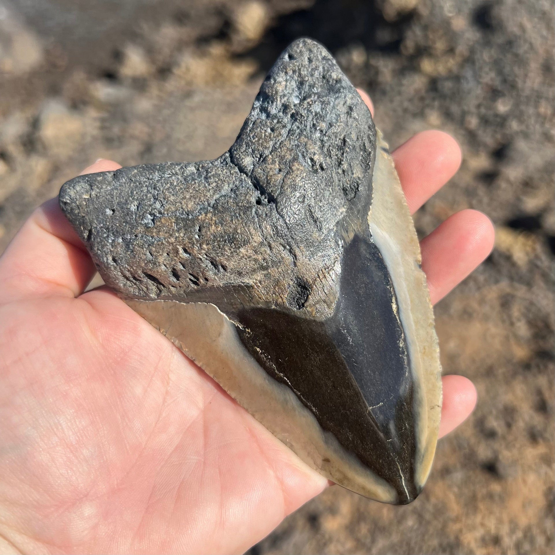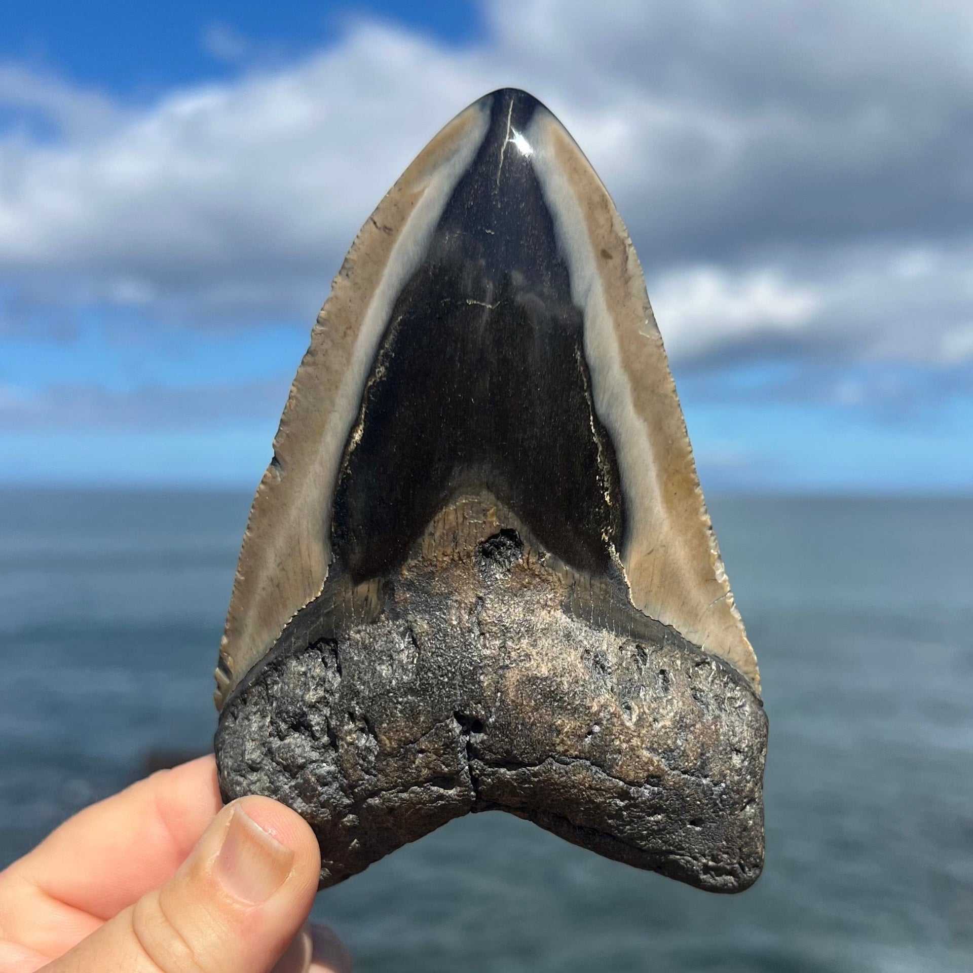 This fossil Otodus megalodon tooth measures approximately 5" from corner to tip on the longest edge. The beautiful warm earthy tones frame the black interior that is revealed by the polishing of the crown. The opposing side of the crown remains unpolished and displays intact enamel. The unpolished root is mottled brown and intact.