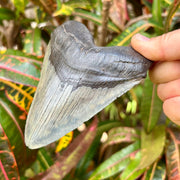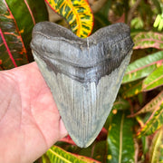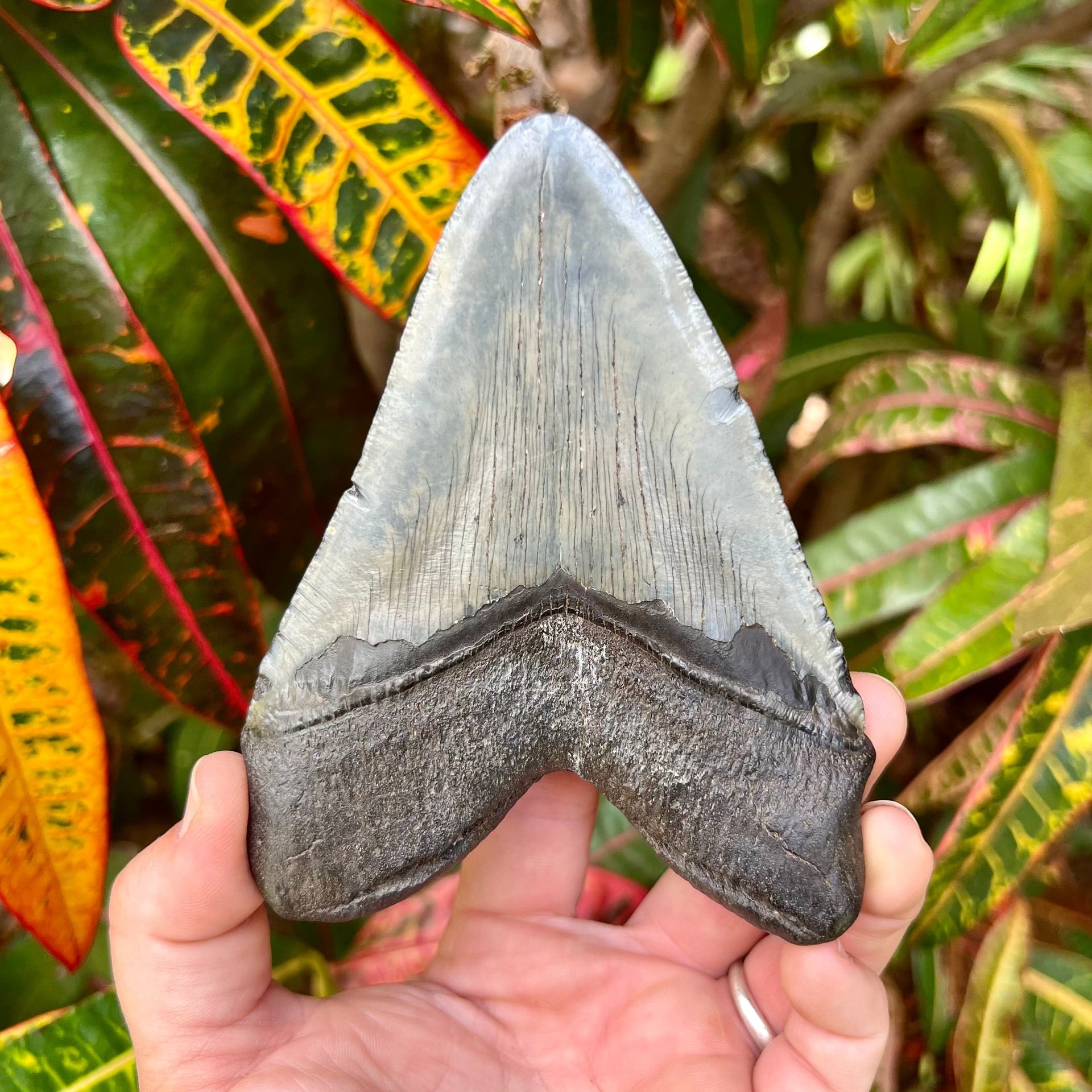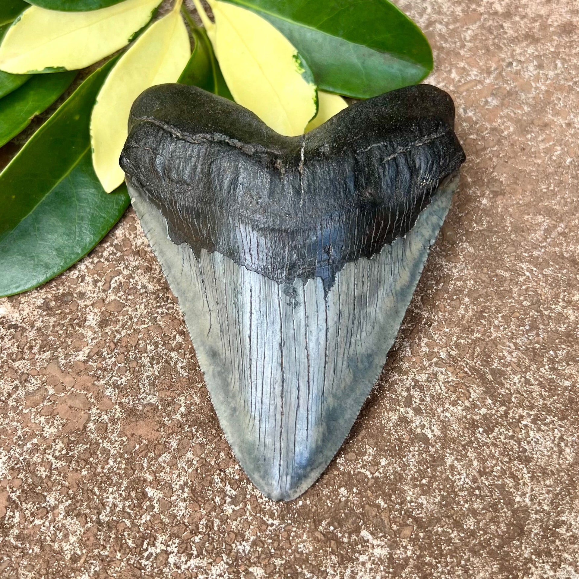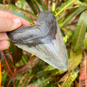 This A grade megalodon tooth measures approximately 4 3/4” from the corner of the root to the tip of the tooth. The tooth has a jet black root and a grey crown. The tooth displays a clear bourlette, great enamel and light serrations.