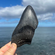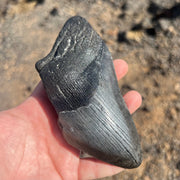 This beautiful, partial Otodus megalodon tooth measures approximately 5 1/4" inches from the corner of the root to the tip of the tooth along the longest edge. This tooth features gorgeous coloration of a deep black root and bourlette with a charcoal grey crown. With its large size and nice details, tooth makes a great first tooth. Add this tooth to your cart now before you miss out!
