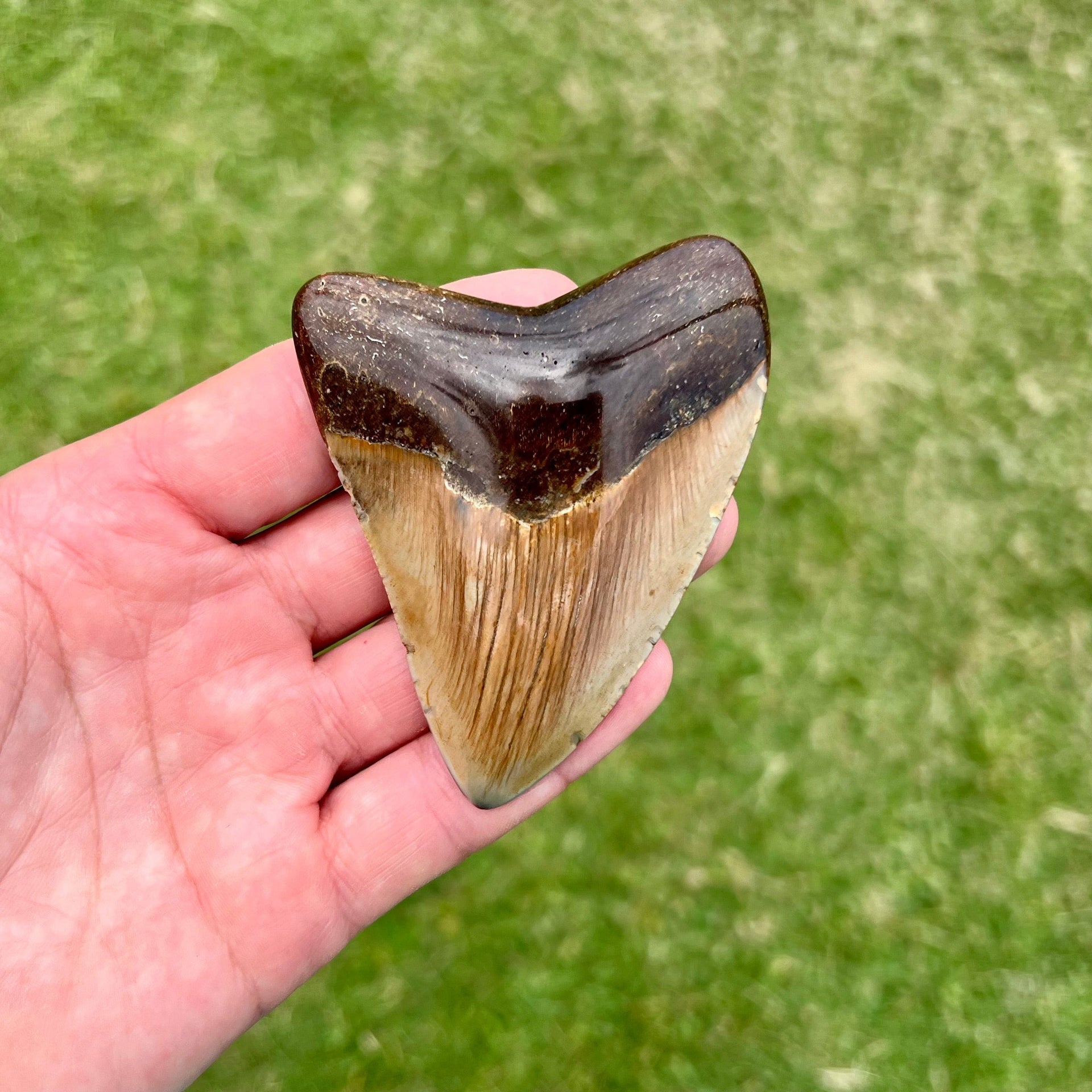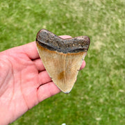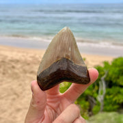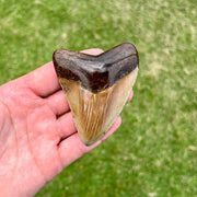 This cute megalodon tooth measures approximately 3 3/8” from the corner of the root to the tip on the longest edge. The polishing of the root brings out the deep browns. The crown is unique in its coloring of earthy shades of orange. Bring home this awesome megalodon tooth and keep the memory of this prehistoric shark alive!