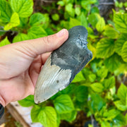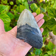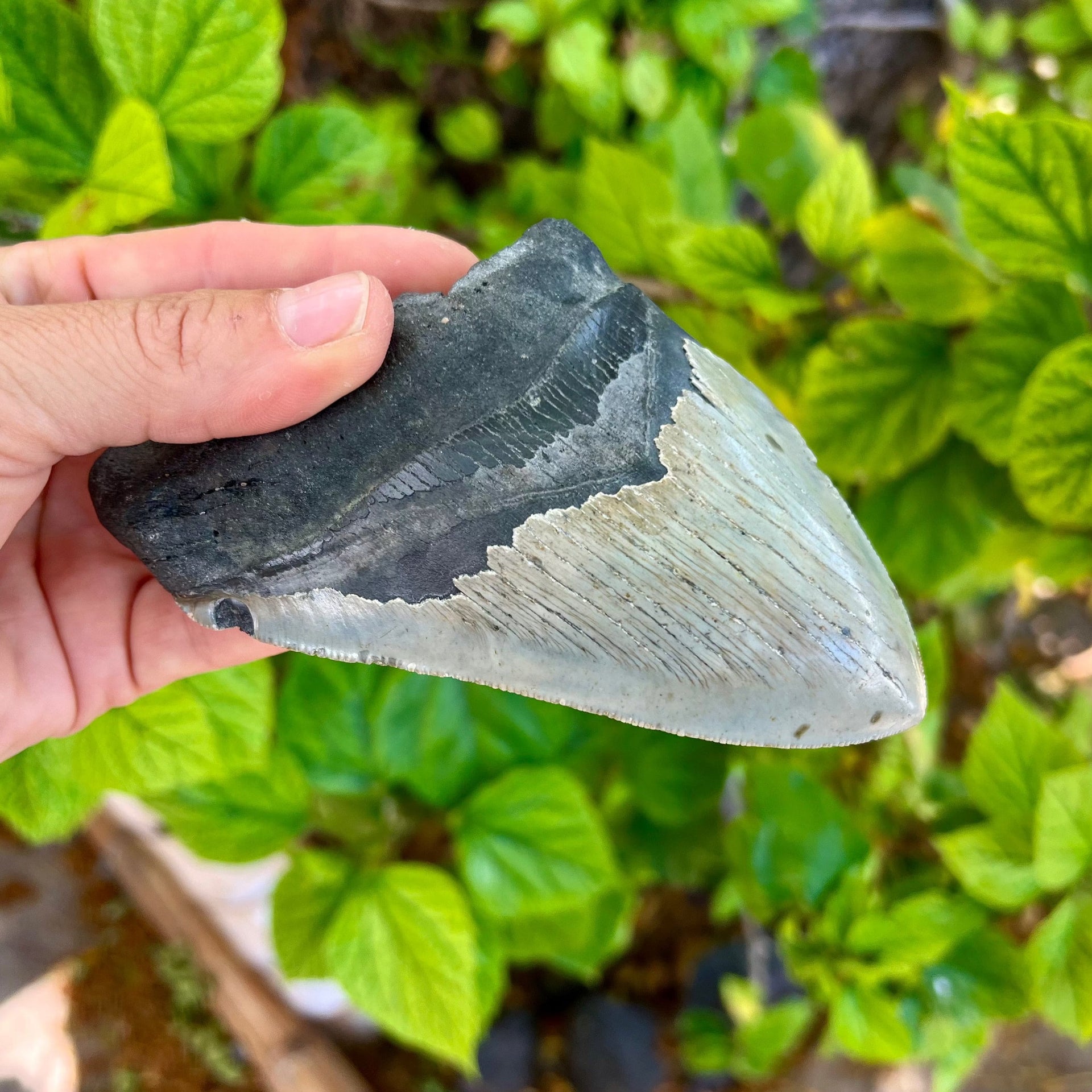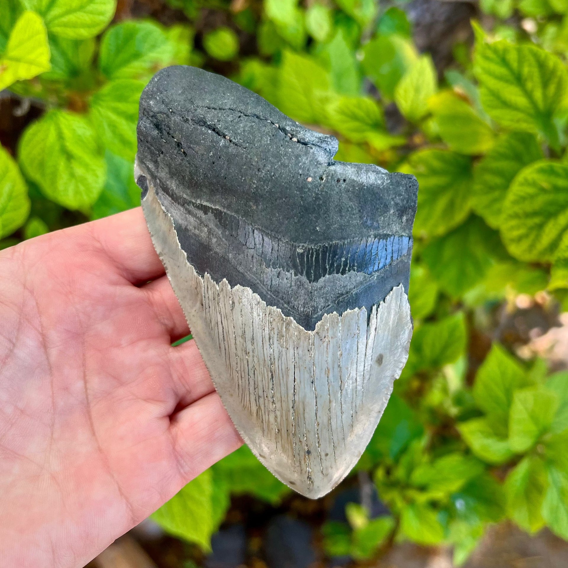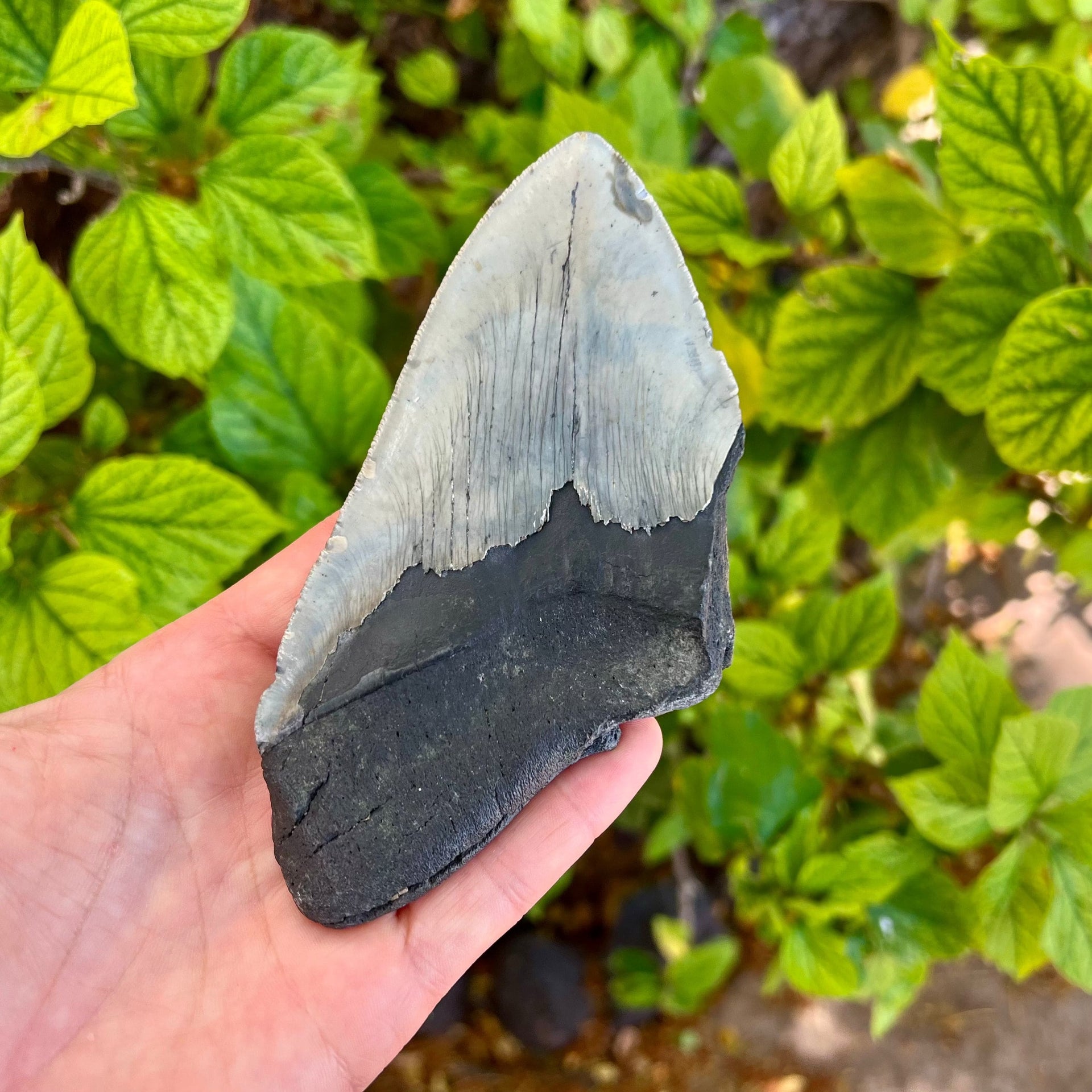 This fossil Otodus megalodon tooth measures 5 1/4“ along the intact edge from the root to the tip. The tooth is grey with a black root and has some nice serrations. This is a great starter tooth or an awesome addition to an existing collection.