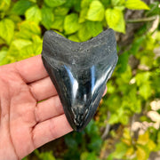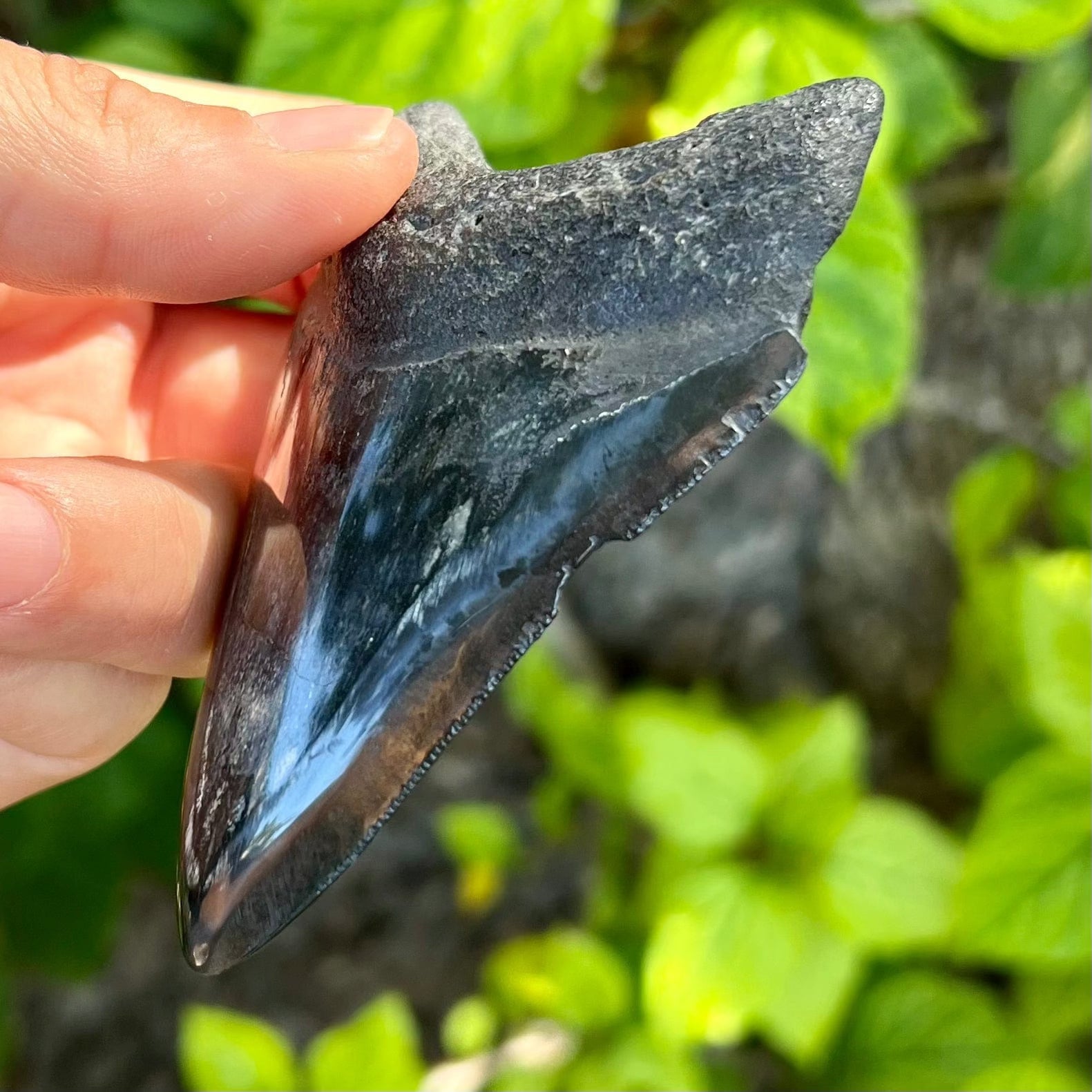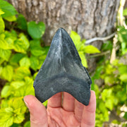 This polished fossil Otodus megalodon tooth measures 3 5/8" from the corner of the root to the tip of the tooth along the longest edge. This tooth features a high polish on the labial side to reveal a black center. The colors are subtle, but are quite bewitching. The lingual side of the crown has the original enamel in a solid black. This is a gorgeous tooth!