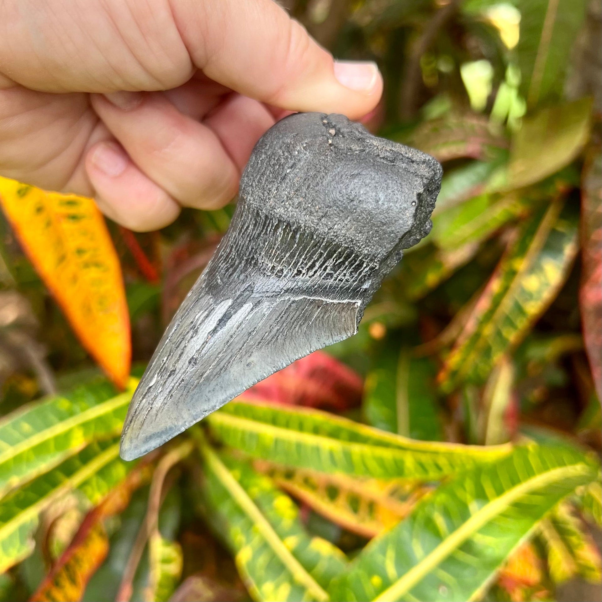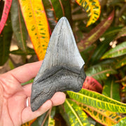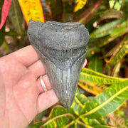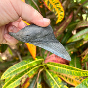 This partial megalodon tooth measures 4 1/4” from the corner of the root to the tip of the tooth on the intact edge. It has a matte black root with a dark charcoal crown with light serrations along both edges. A great tooth for the budding fossil collector!