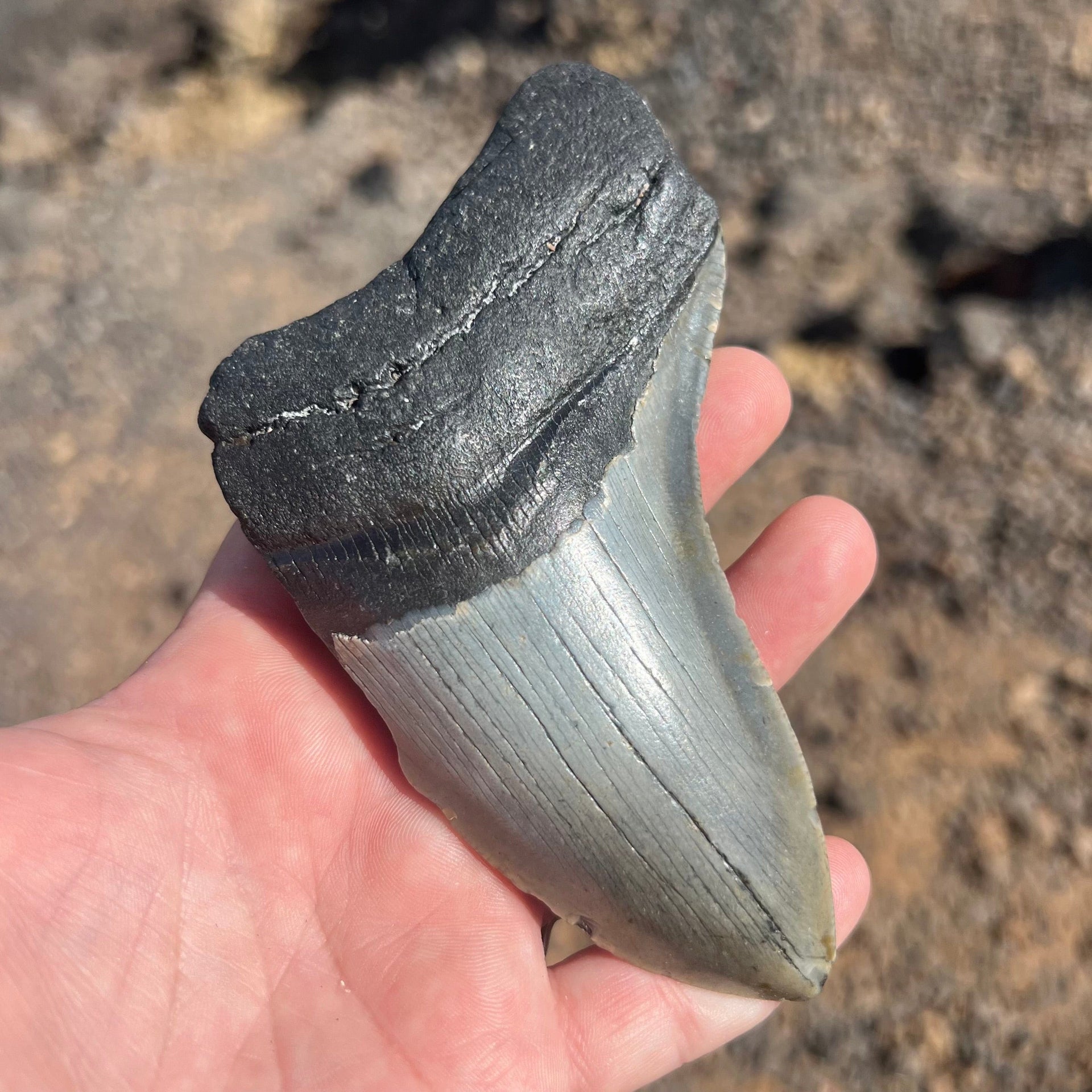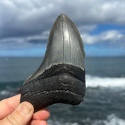 This partial Otodus megalodon tooth measures approximately 5" inches from the corner of the root to the tip of the tooth along the longest edge. This tooth features gorgeous coloration of a deep black root and bourlette with a charcoal grey crown. With its large size and nice details, tooth makes a great first tooth. Add this tooth to your cart now before you miss out!