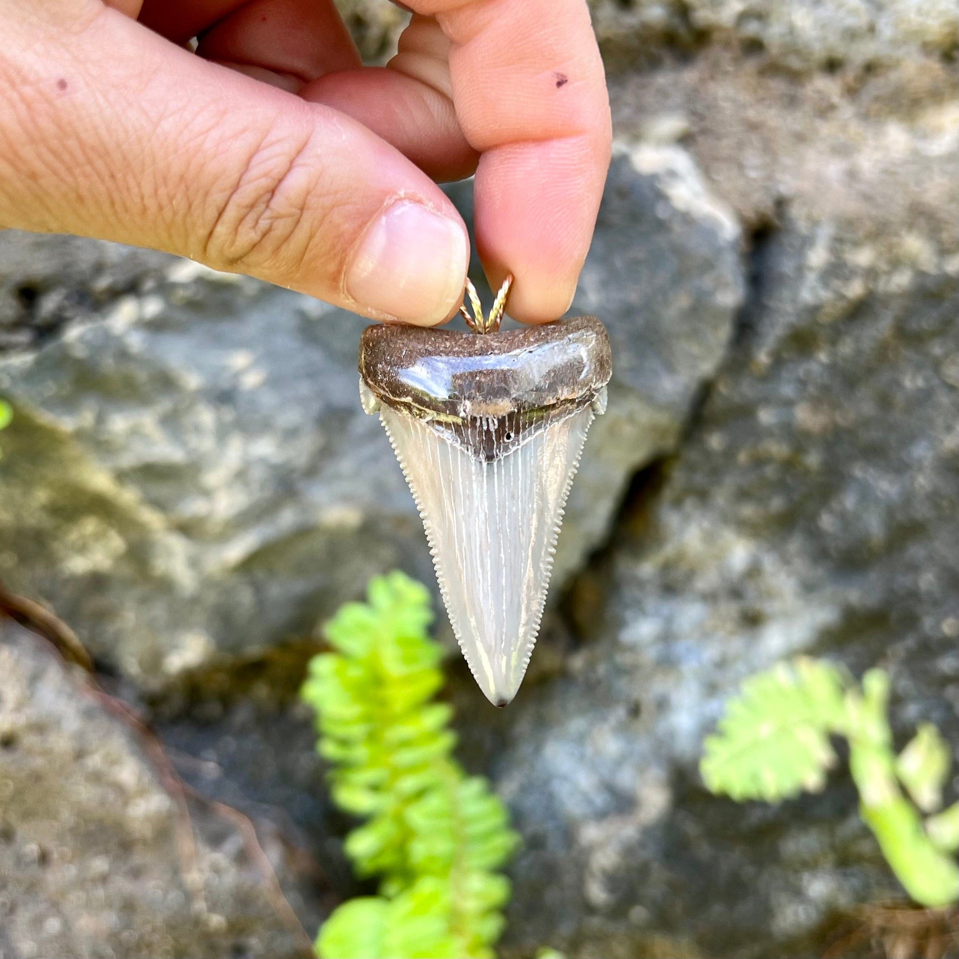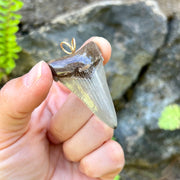 This beautiful auriculatus fossil tooth pendant features deep golden browns and earthy greys. The tooth displays a well defined bourlette and cusps, and the serrations are quite nice. The tooth measures 2” long from crown to tip. The bale is a heavy gauge gold fill hardwire and can easily be added to a stunning necklace chain. Although this pendant does not come with a chain, Whaler's Locker has a handful of options that will accent this tooth perfectly. Purchase this pendant for yourself or a friend!