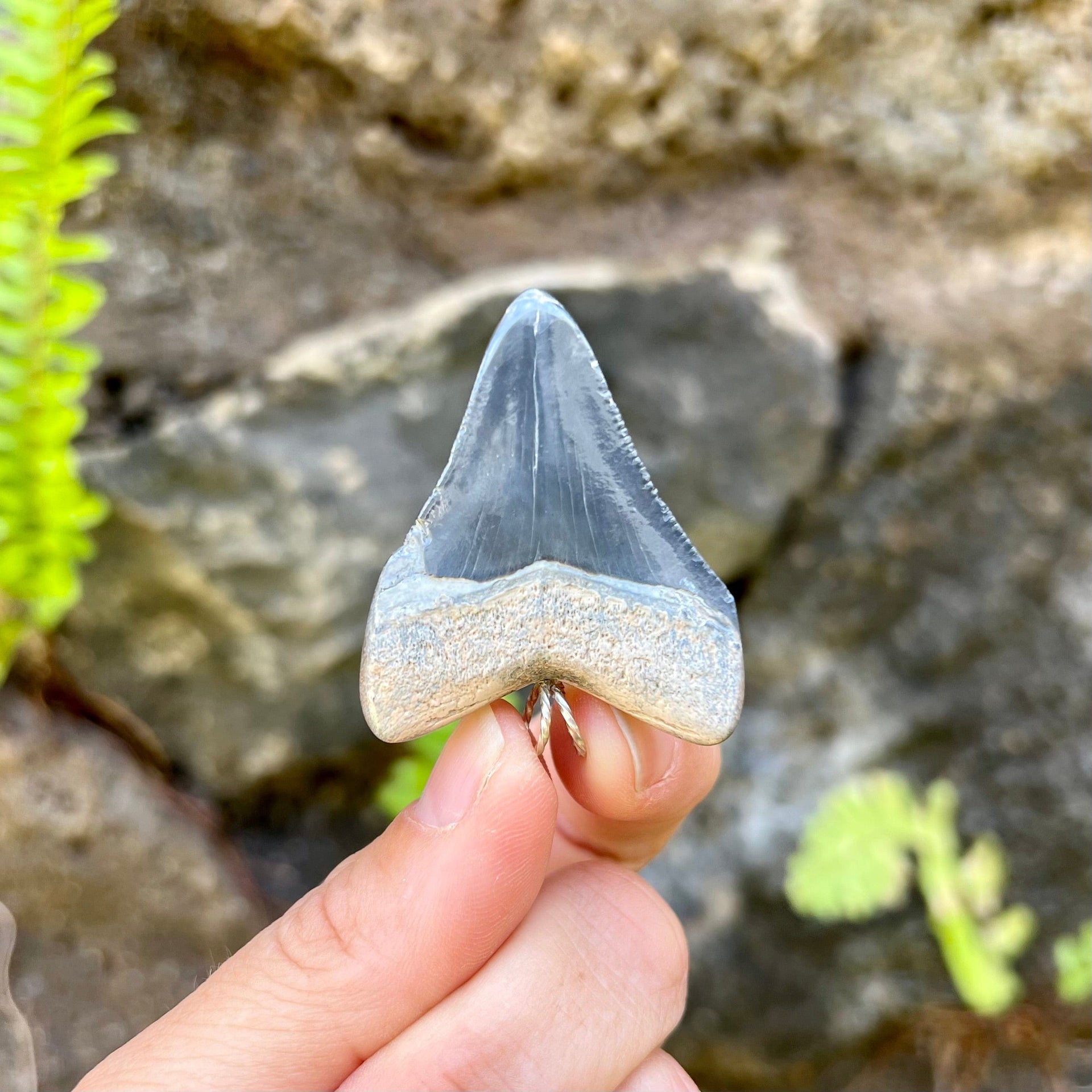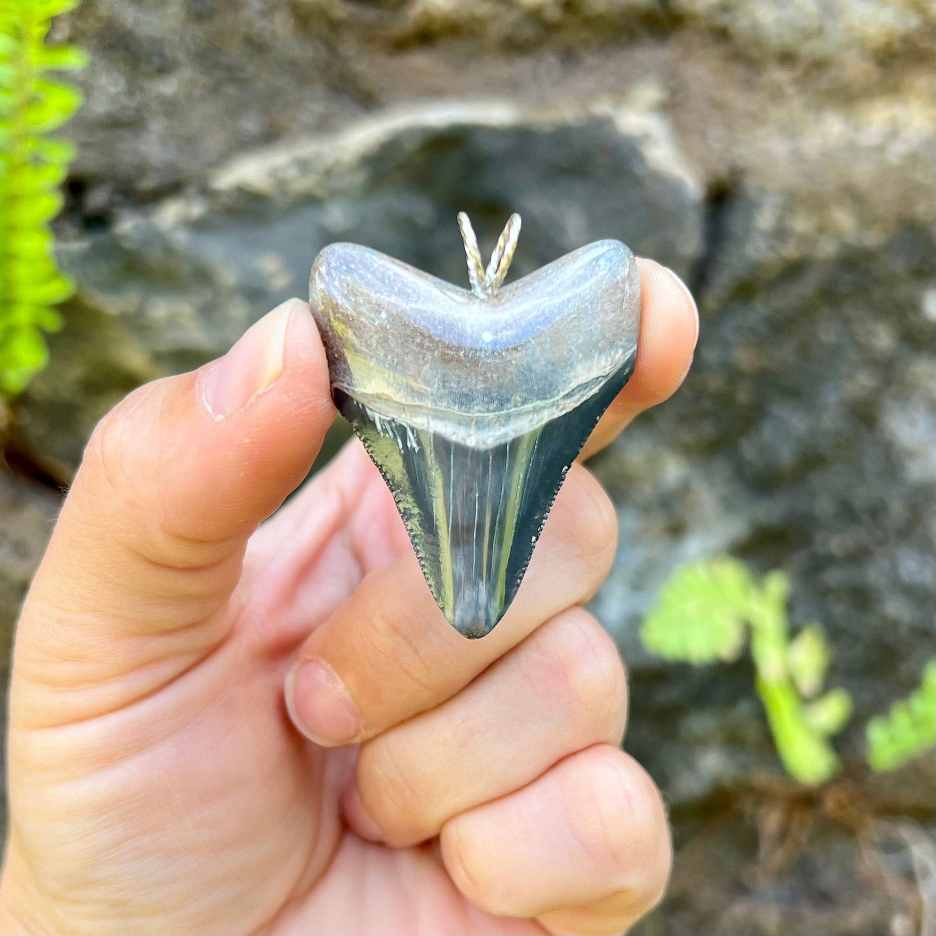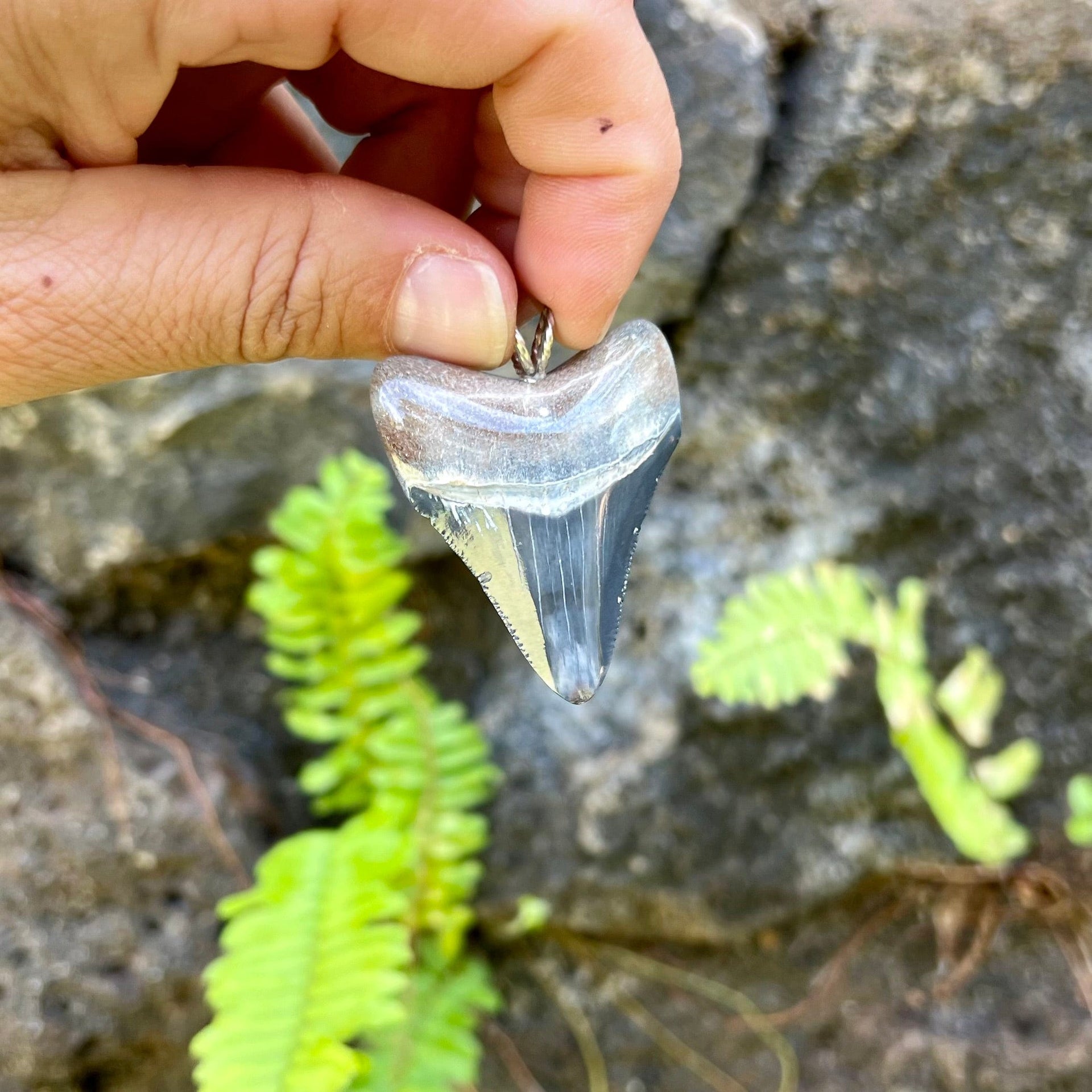 Our Bone Valley Megalodon Tooth Pendant features unique coloring with a grey blue root and the rich charcoal on the crown. The shark tooth measures approximately 1 7/8” from the tip of the tooth to the corner of the root along the longest edge, and the root is 1 1/2” wide. The bale is made with Sterling silver hard wire.