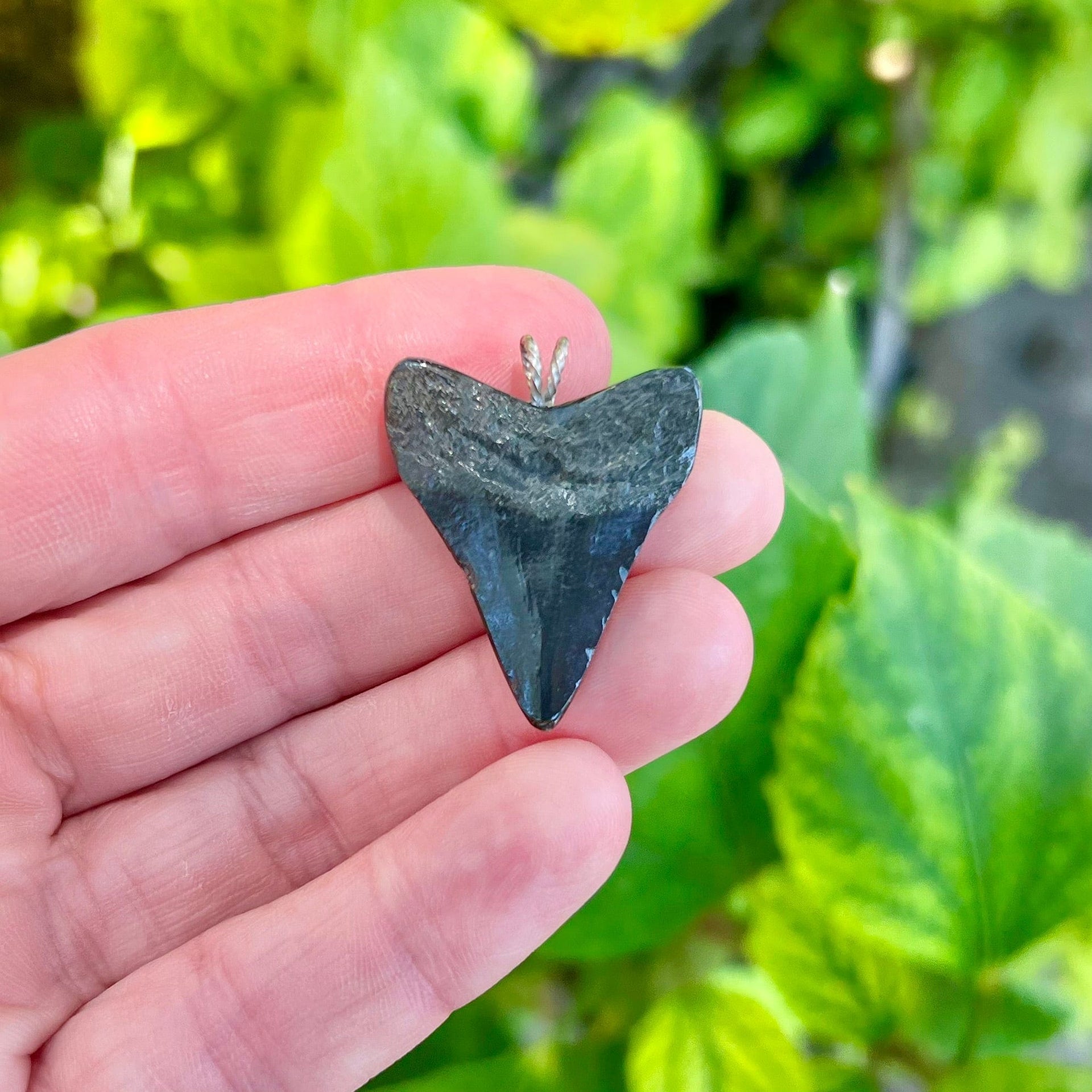 Just because the word megalodon means “big tooth” doesn’t mean they are all massive. This petite meg tooth has a deep black coloring with some slight hints of mottling on the crown. This tooth measures 1 1/4” from tip to corner of root. The bale is made from heavy gauge sterling silver wire. A very charming tooth. Don’t let it be the one that got away!