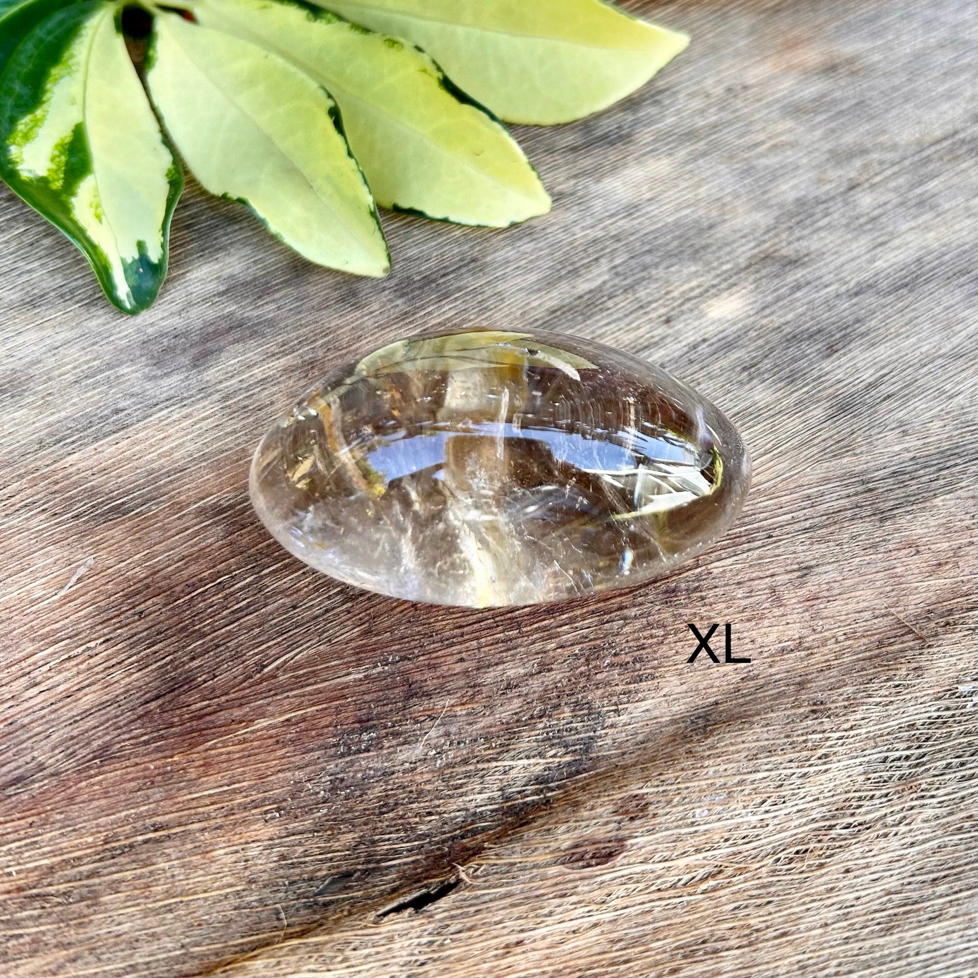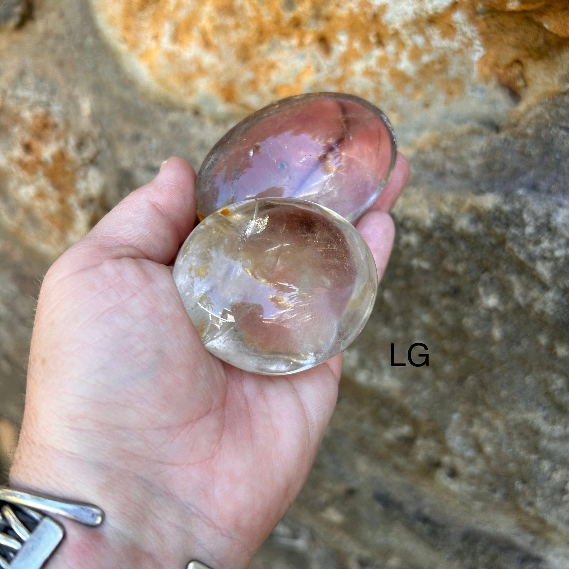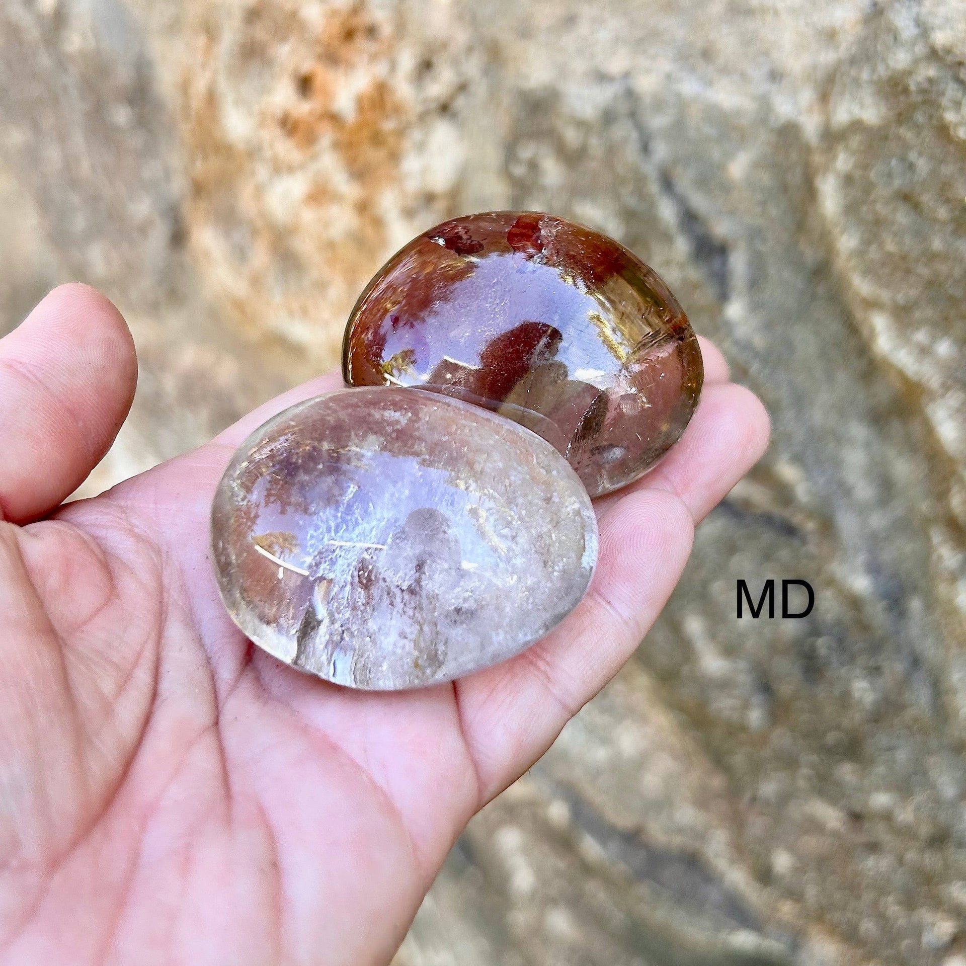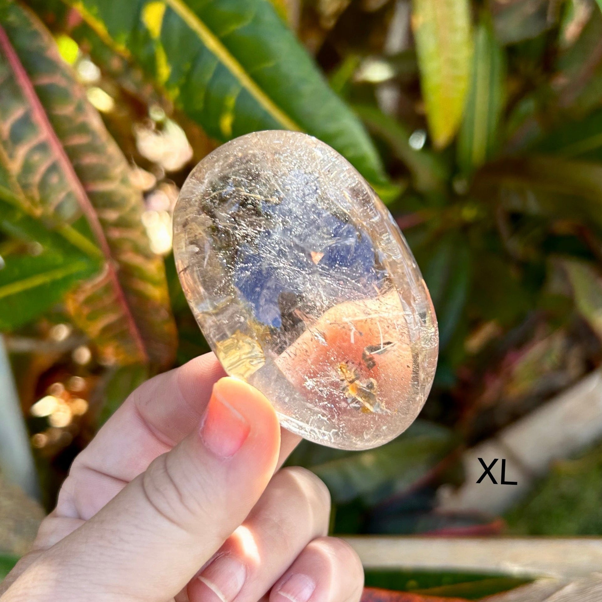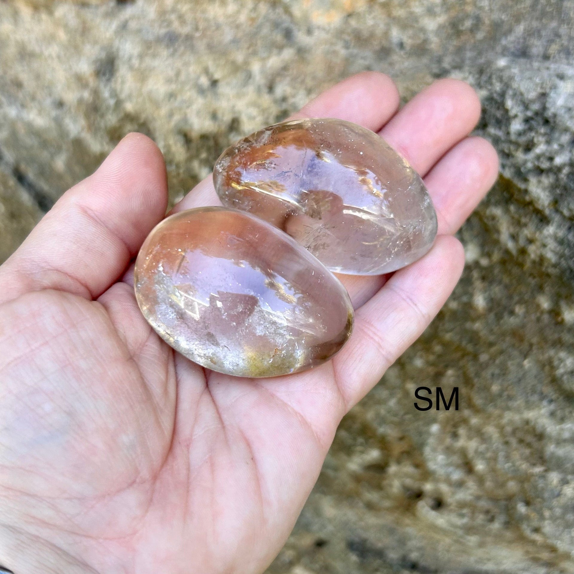Extra Large palm stone measures 2 1/2" by 1 3/4" and about 1 1/2" thick. ( Only one piece is available in this size. You will receive the exact quartz shown in the image.)