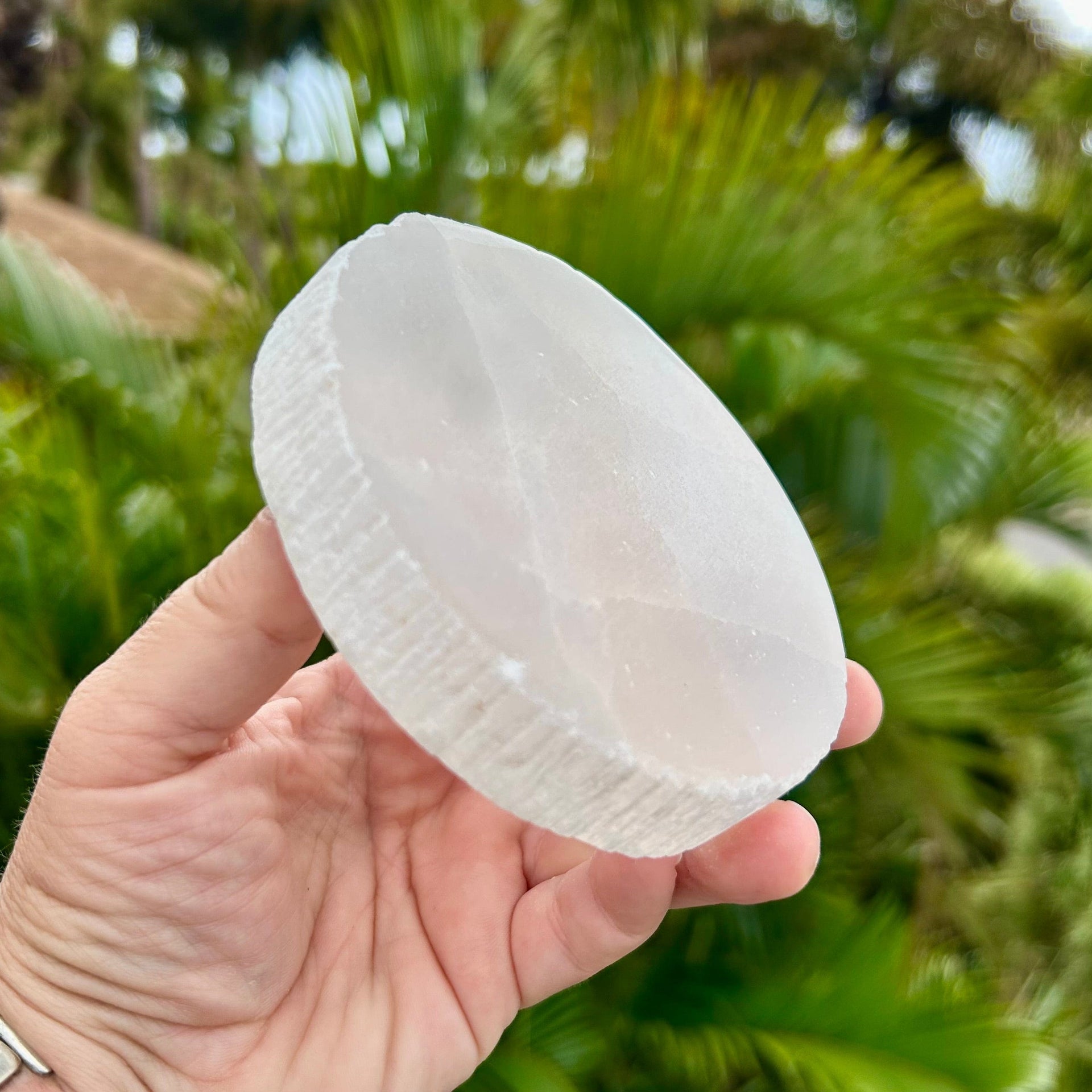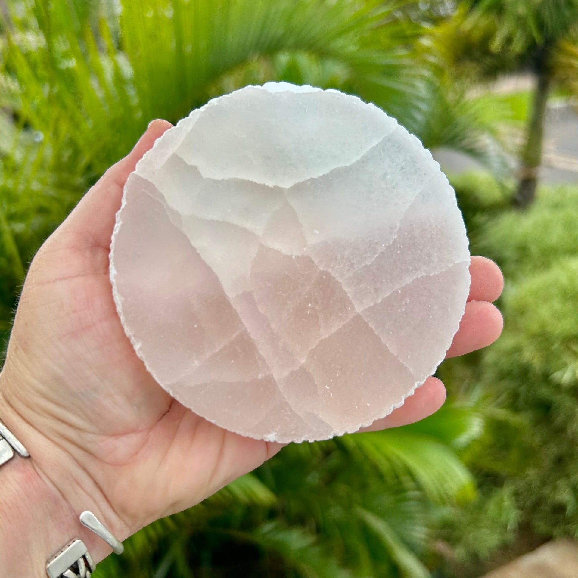 This beautiful Round Selenite Slab is perfect for presentation of your treasures, or to recharge your crystals. Selenite is known to be a crystal of rejuvenation, and can be used to cleanse and reenergize your crystals. The polished slab measures approximately 4" in diameter and 3/4' thick.