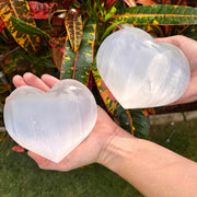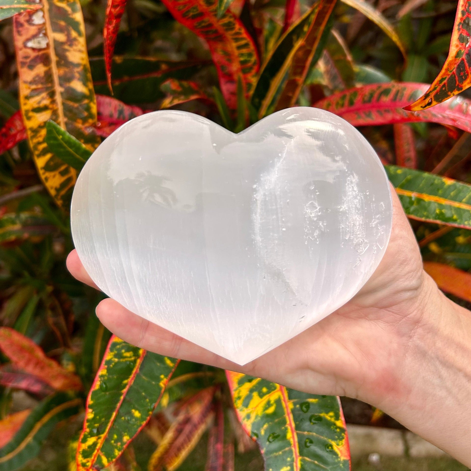 This beautiful selenite, a crystalized form of gypsum, has been hand carved and polished into a heart. This polished heart measures approximately 5 1/2” by 5" by 2". While it can be found worldwide, this selenite was sourced from Morocco.