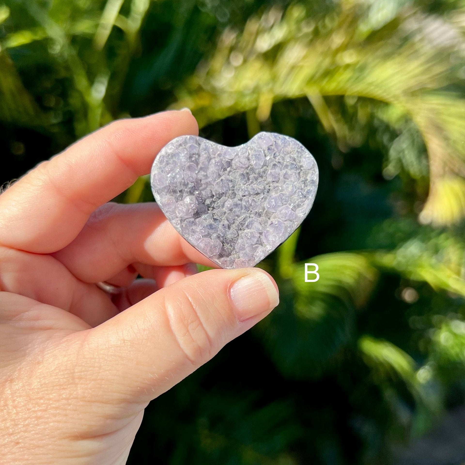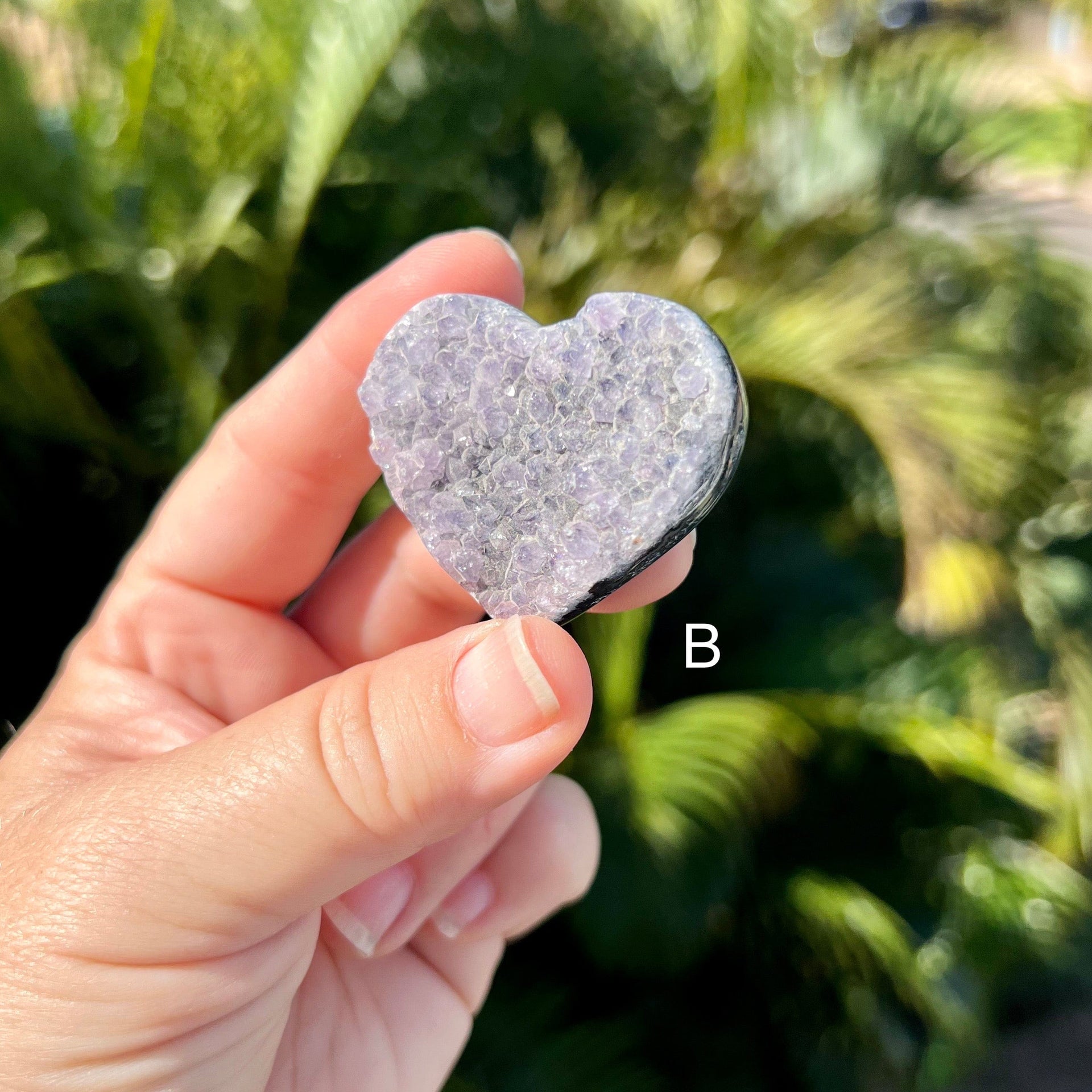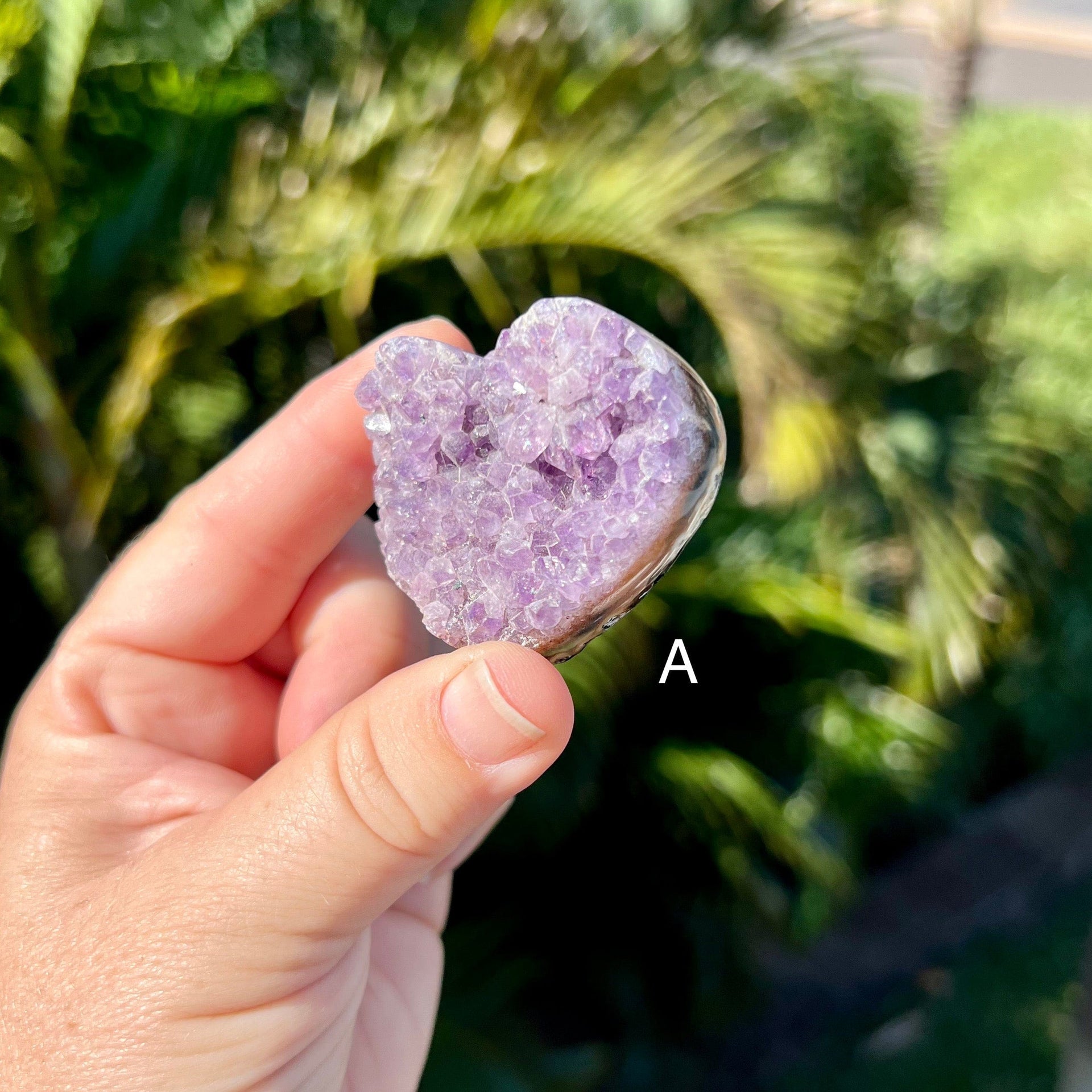 These sparkling, violet amethyst hearts are a beautiful addition to any space that needs a bit of love and light. Heart A measures 1 7/8” by 2" across the face and approximately 3/4” thick. Heart B measures 1 3/4" by 1 1/2" across the face and approximately 1/2" thick. The edges have been smoothed to reveal the layers of the amethyst quartz crystal.