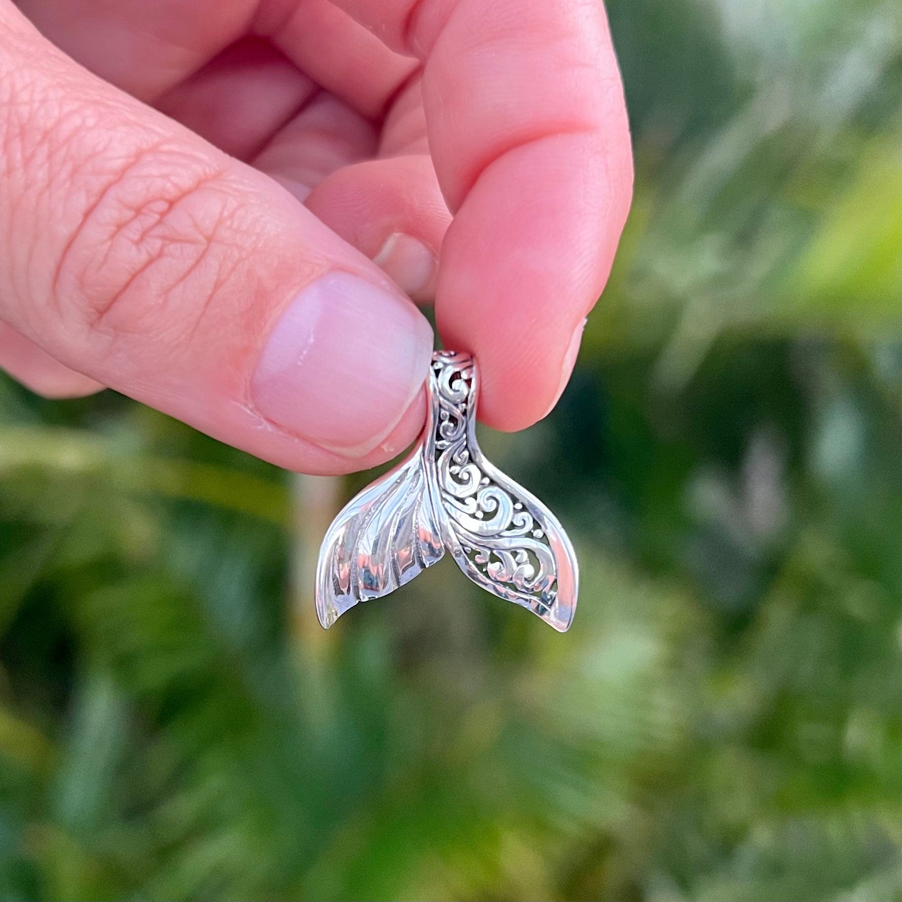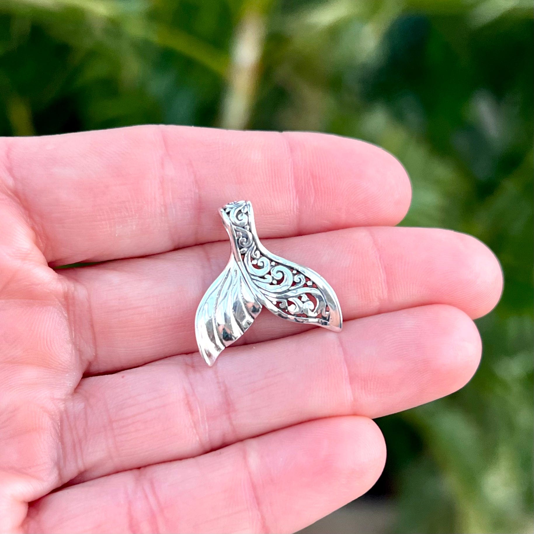 This .925 sterling silver Whale Tail Pendant with Filagree Accent features Zak's classic filagree design on half of the tail with a contrasting smooth silver on the other half. This pendant measures 7/8"x 7/8".