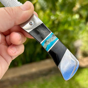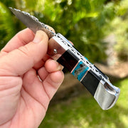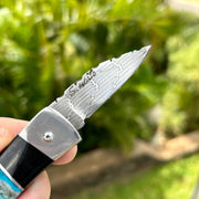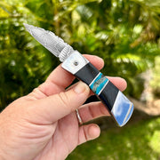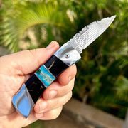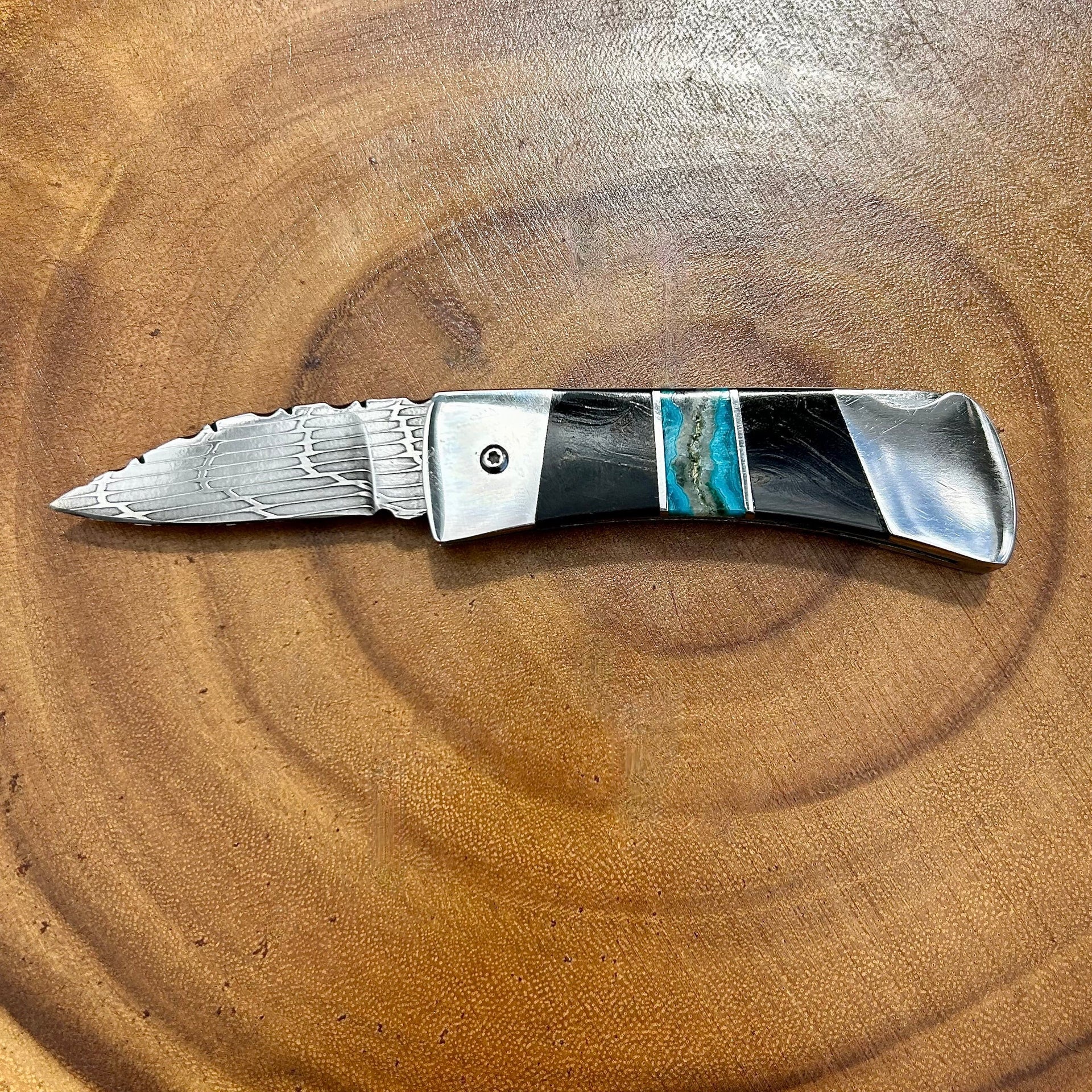This one-of-a-kind, lock back folder features hand-forged stainless steel Damascus by Steve Nolte. The handle is inlaid with Hawaii's state gemstone black coral, and chrysocolla gemstone. The knife has a lock back style lock. The total length of the knife open is 5 1/4", closed measures 3 1/8" with a blade length of 2". This entire Steve Nolte Damascus knife was handcrafted in the United States of America.