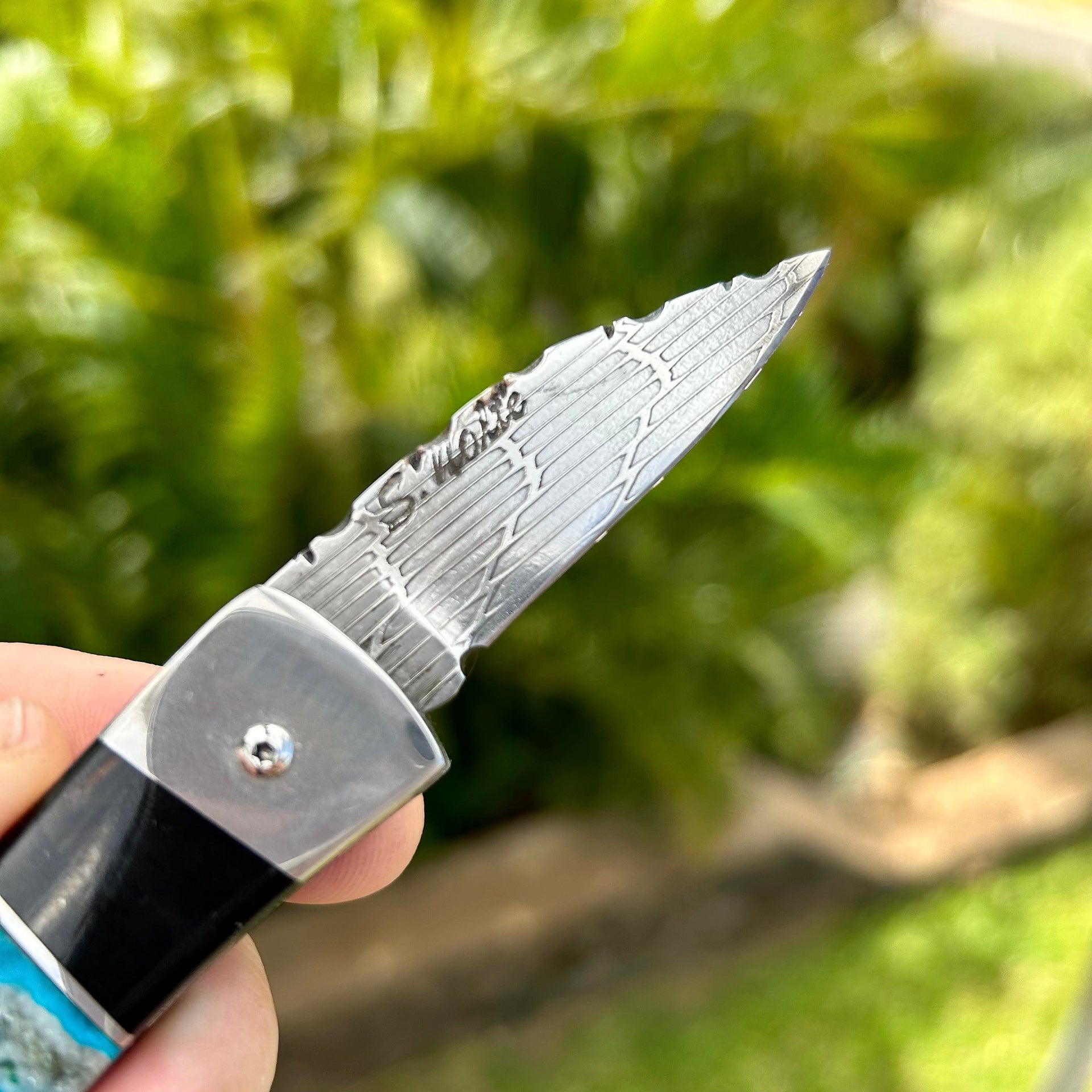 If you’re looking for a beautifully crafted folding knife that will last the rest of your life all while serving a good cause, you cannot go wrong with Steve Nolte Stainless Steel Damascus Folder with Black Coral and Chrysocolla Inlay. This exclusive knife, along with two fixed blade knives were so generously donated by Steve and Barbie Nolte to help Whaler's Locker rebuild after the catastrophic fire and loss of our shop in Lahaina. We are so grateful to have such wonderful, talented friends.