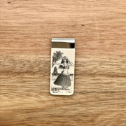 This scrimshaw money clip features a metal backing and comes in your choice of several scrimshaw designs, all hand-cast out of the original artwork by artist Linda Layden. The money clip measures nearly two inches long and three-quarters of an inch wide.