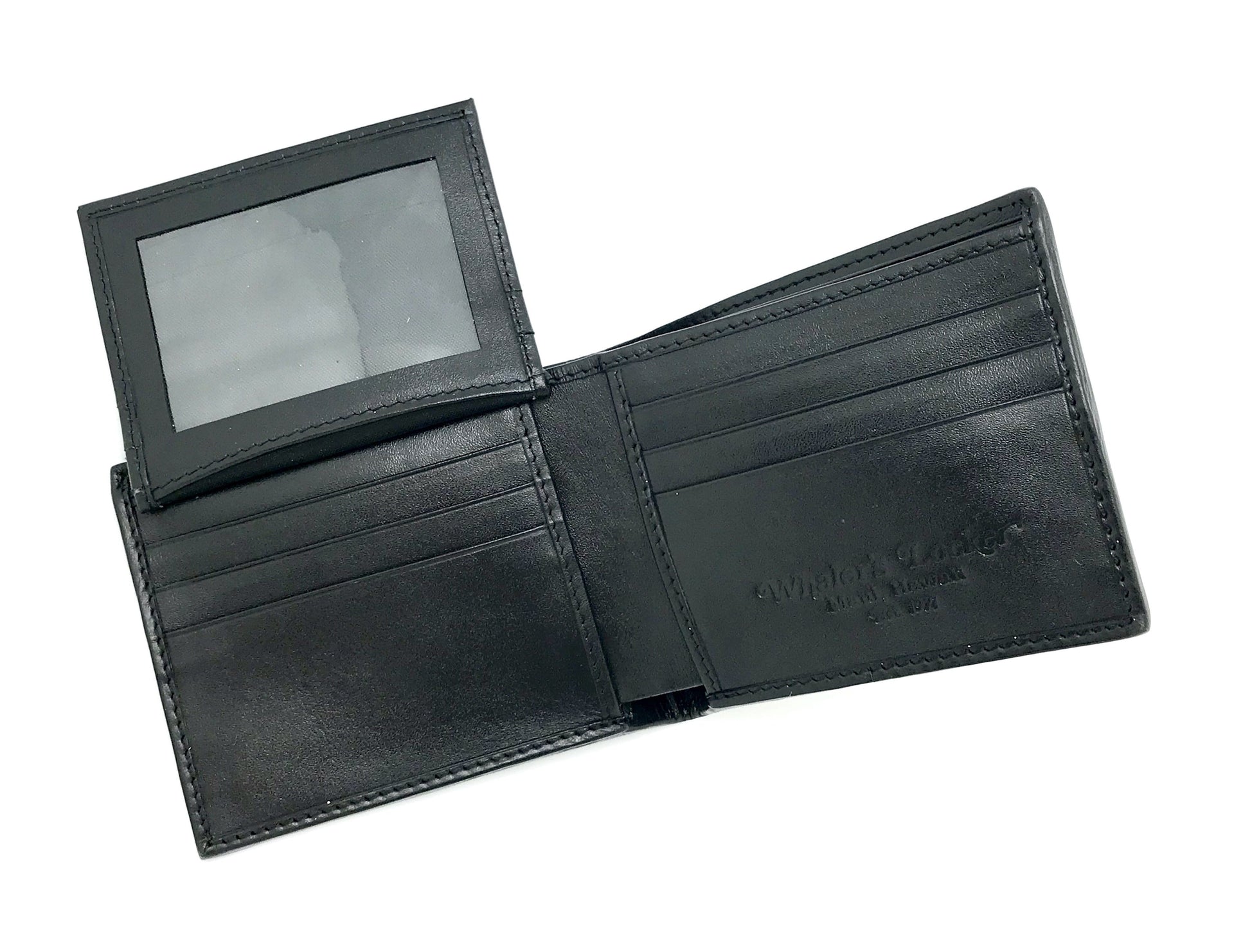 The interior of our stingray leather wallet is made with cow leather and includes a divided bill carrier, nine individual slots for cards, and a plastic sleeve for identification. The billfold comes in black and features the Whaler's Locker logo imprint on the inside.