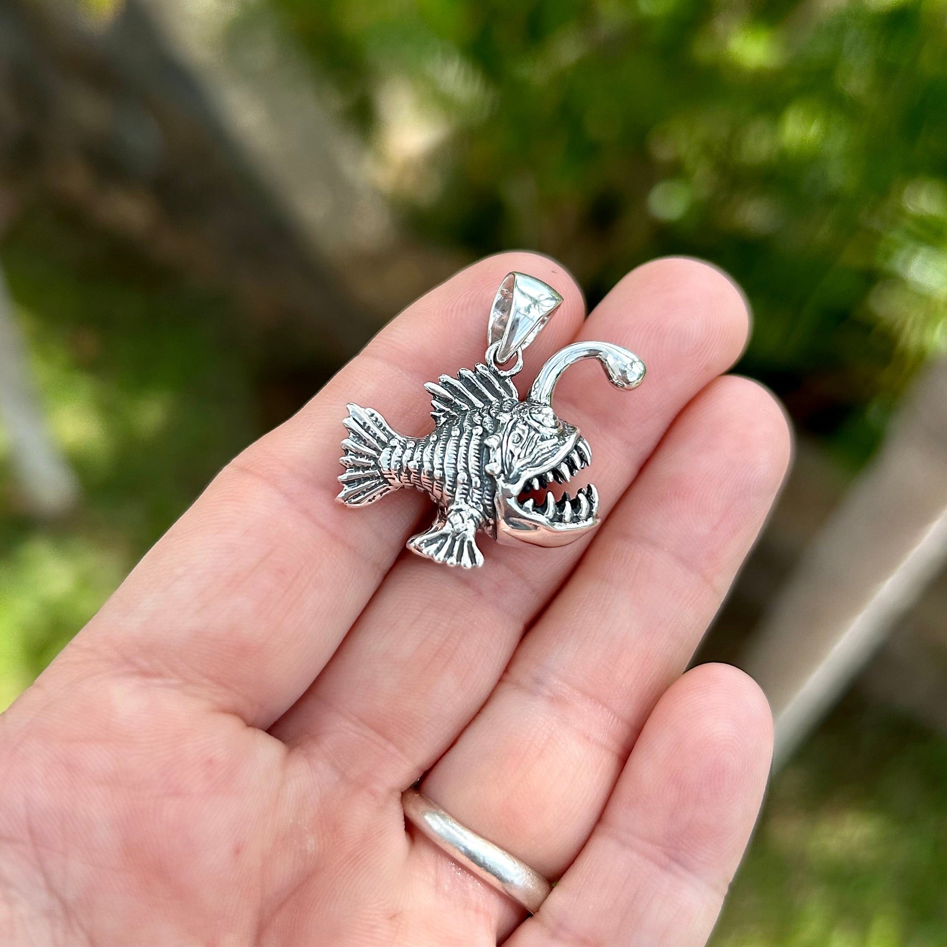 Our Angler Fish Pendant is really one-of-a-kind, and perfect for that one-of-a-kind person in your life. The pendant is cast in high quality .925 sterling silver and measures approximately 1 1/4" from the top of the bale to the bottom of the charm.