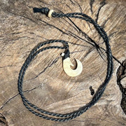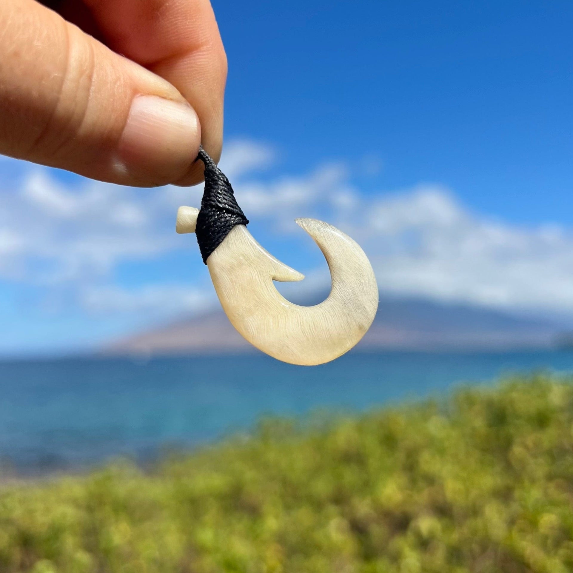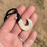 Hand carved Maui fish hook made by local artist Ray Peters. This stunning hook is carved out of Hawaiian Mouflon sheep horn sourced from the Big Island, and measures 1 1/2” tall. Hand wrapped with a handmade flemish twist Dacron cord in black.