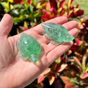 You will receive one green fluorite hand carved sea turtle similar to the ones pictured, chosen lovingly at random. Measures approximately 2 1/2" x 1 1/2". Due to the natural variations of the carving and the fluorite crystal, each sea turtle will have its own unique characteristics.