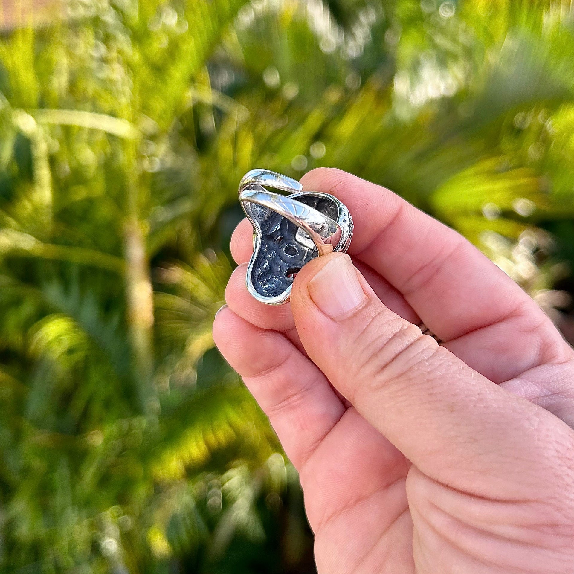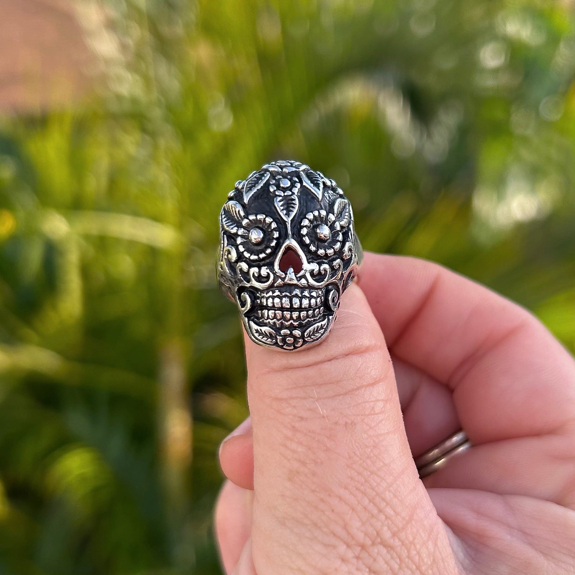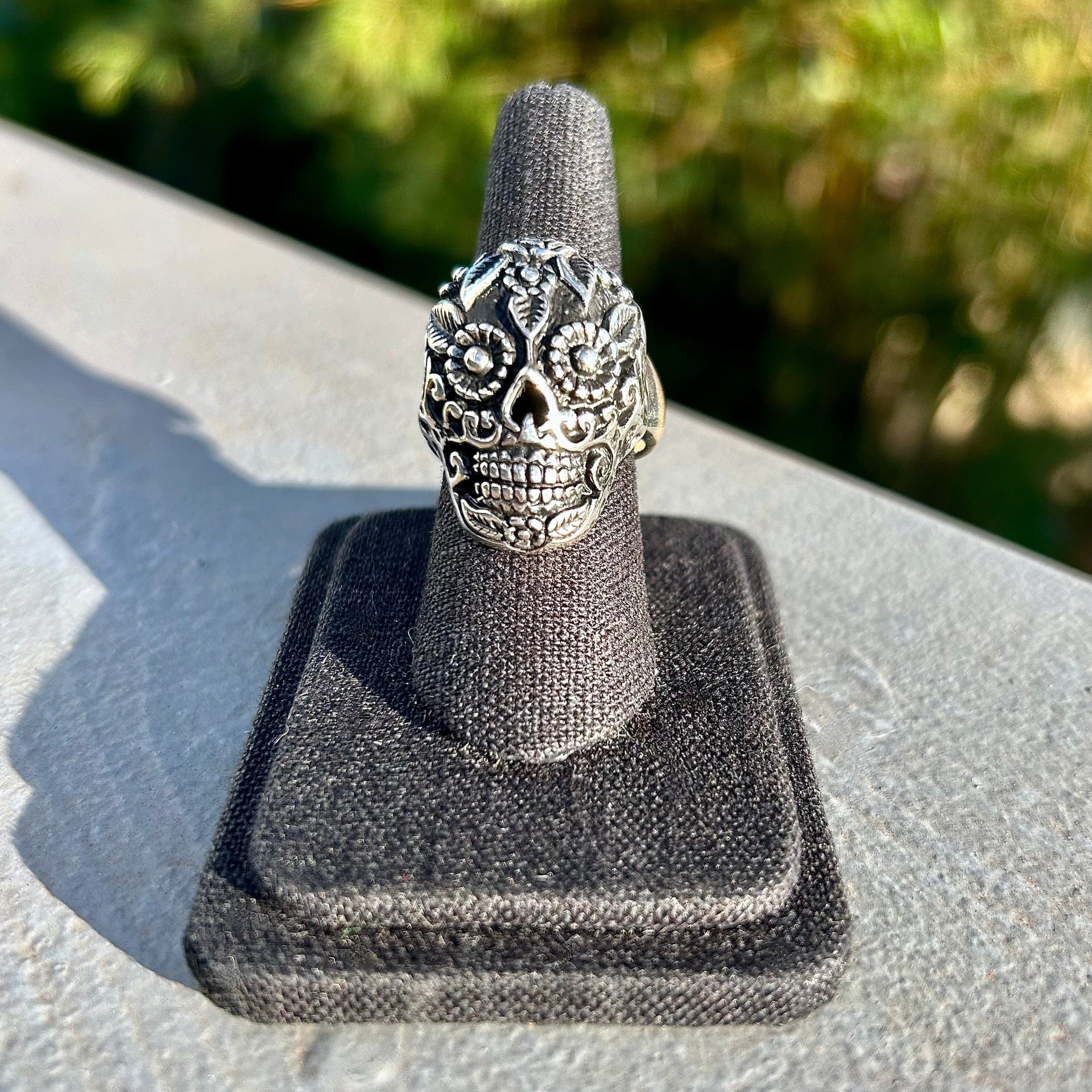For those with an edgier side, you will love our Floral Sugar Skull Adjustable Ring. The ring is cast in high quality .925 sterling silver. The Floral Sugar Skull measures approximately 1 1/4" by 1" and is set with an adjustable band.