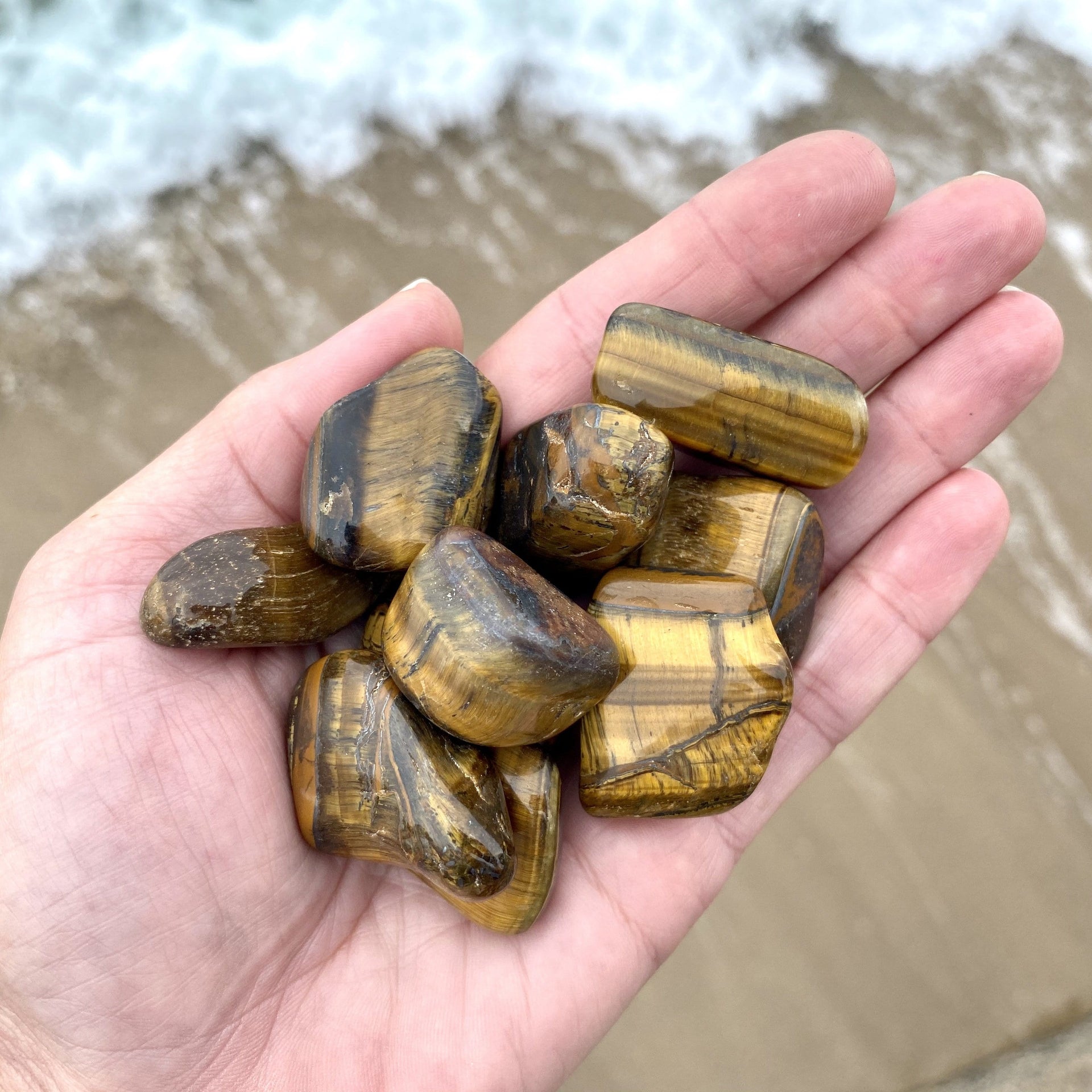 Each polished tiger eye pebble measures approximately 1”.