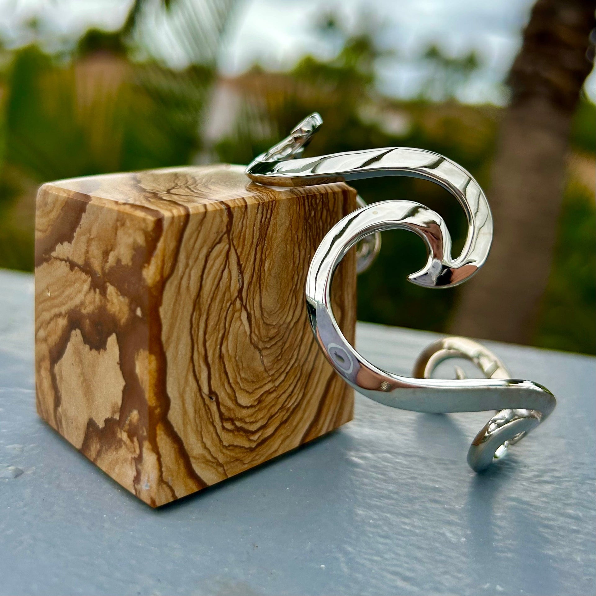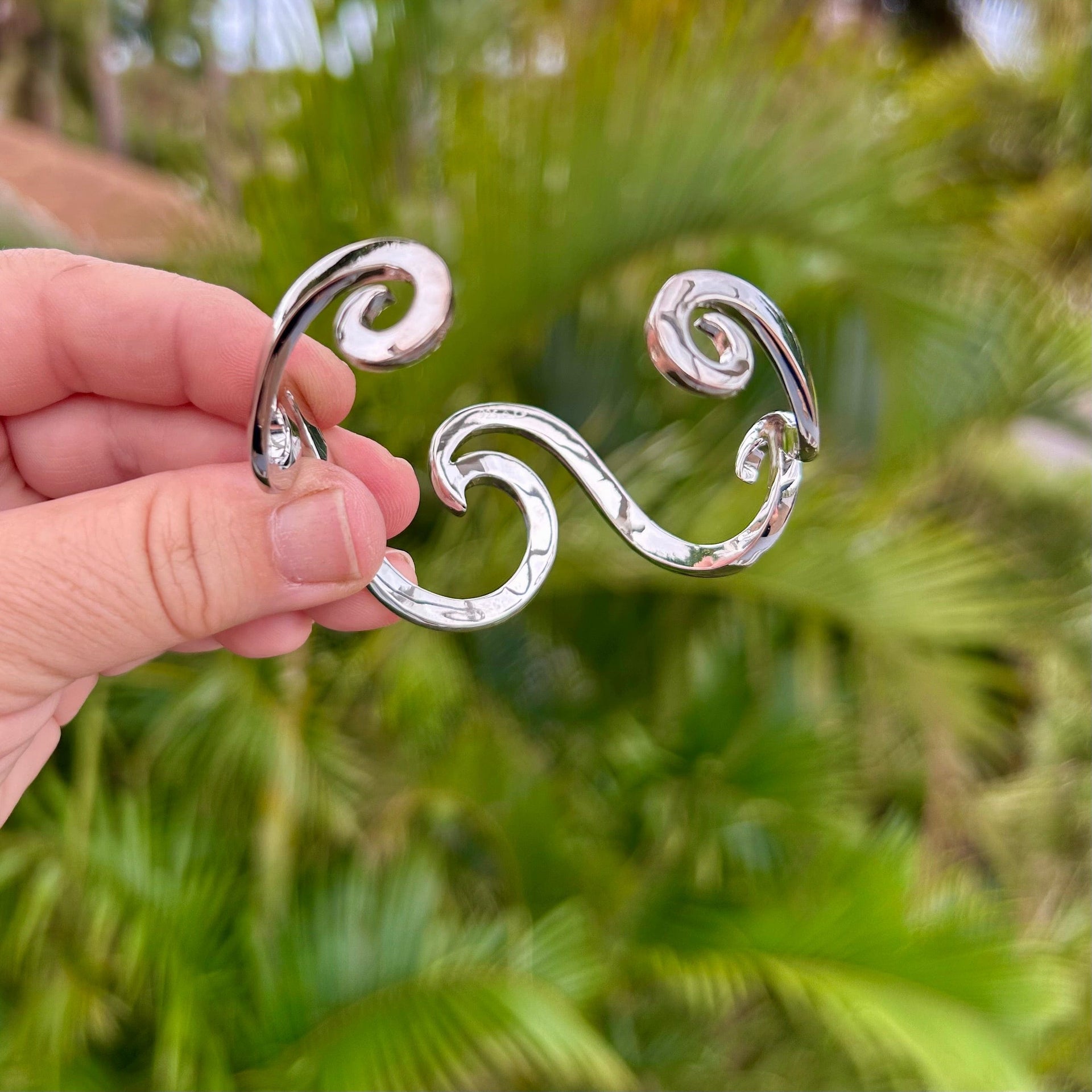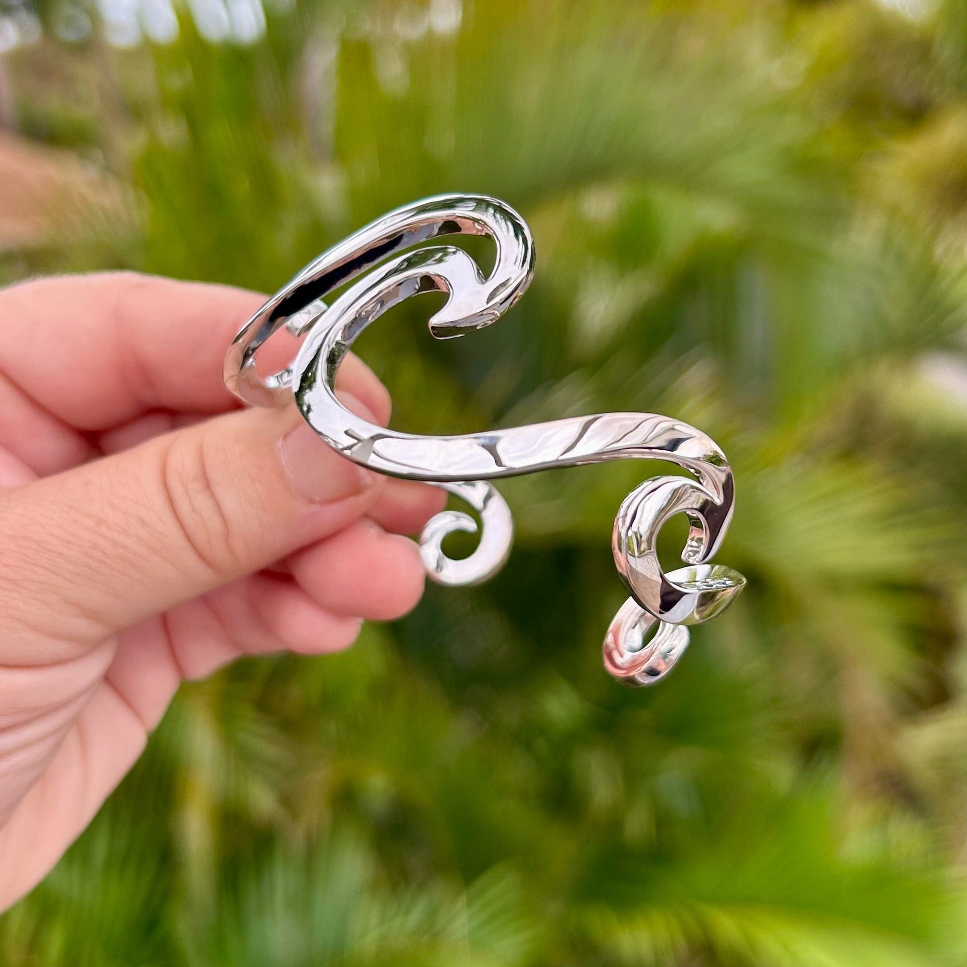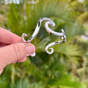 Take your love of the ocean with you everywhere by wearing our elegant Wave Cuff Bracelet designed by artist Catherine Conarroe. The bracelet is cast in high quality .925 sterling silver, and measures 2 1/2" wide by 2" tall.